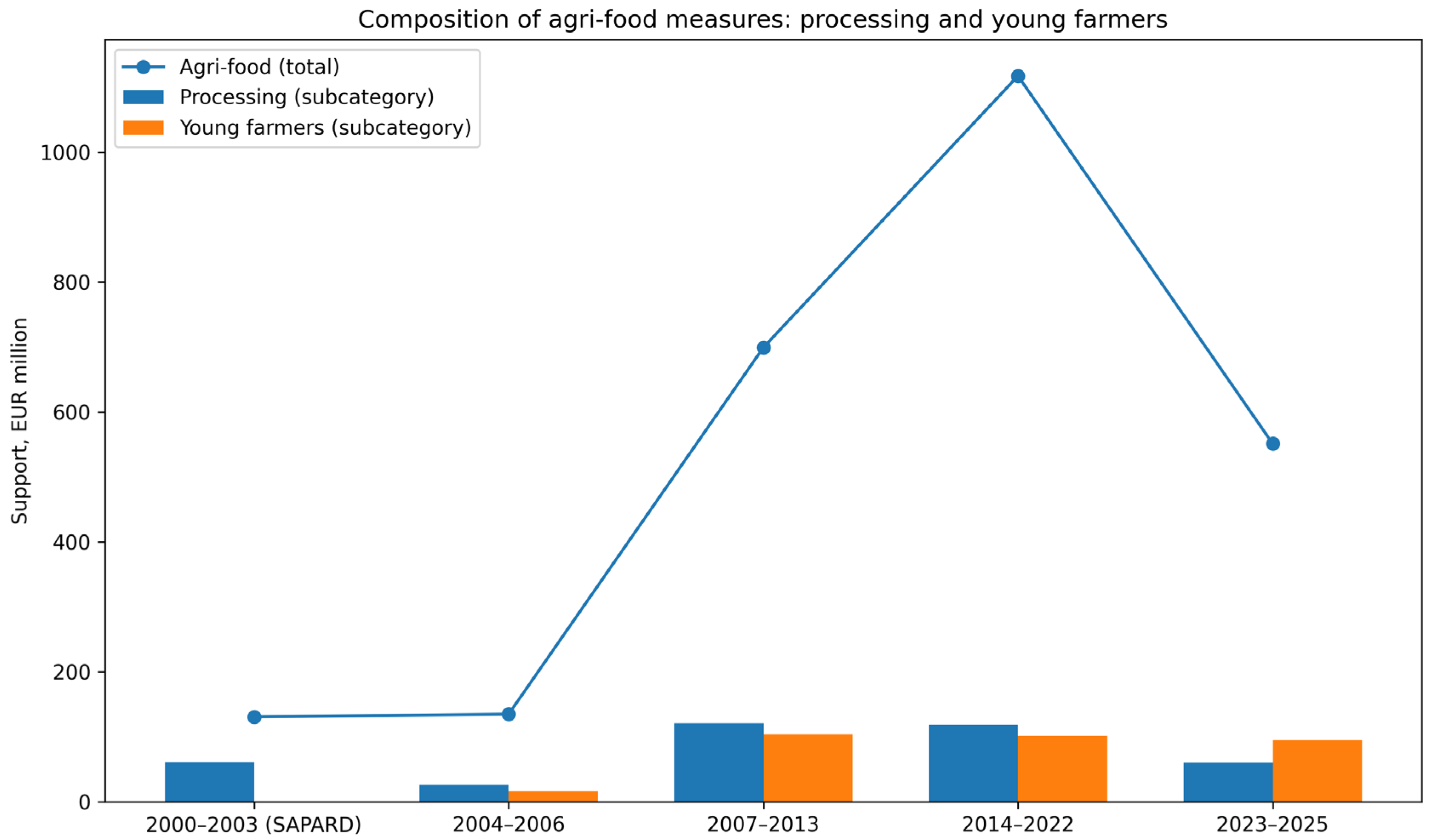 Rural development support expanded sharply after EU accession, with the highest annualized support intensity observed in 2007–2013 and a similarly high level in 2023–2025. From the perspective of the support instrument portfolio, this indicates a substantial increase in the public resources available for structural adjustment, modernization, and rural development. At the same time, the internal composition of support matters as much as its scale. Under SAPARD, agri-food measures accounted for a dominant share of the rural development envelope, and processing support represented a relatively large component within it. After 2007, however, the share allocated to processing remained broadly stable at around 4–5% of total rural development budgets, even as total second-pillar financing expanded substantially. This suggests that downstream upgrading was supported, but not scaled in proportion to the overall growth of the policy envelope. Support for young farmers became more visible in 2023–2025, which is consistent with the stronger policy emphasis on generational renewal in recent CAP implementation.