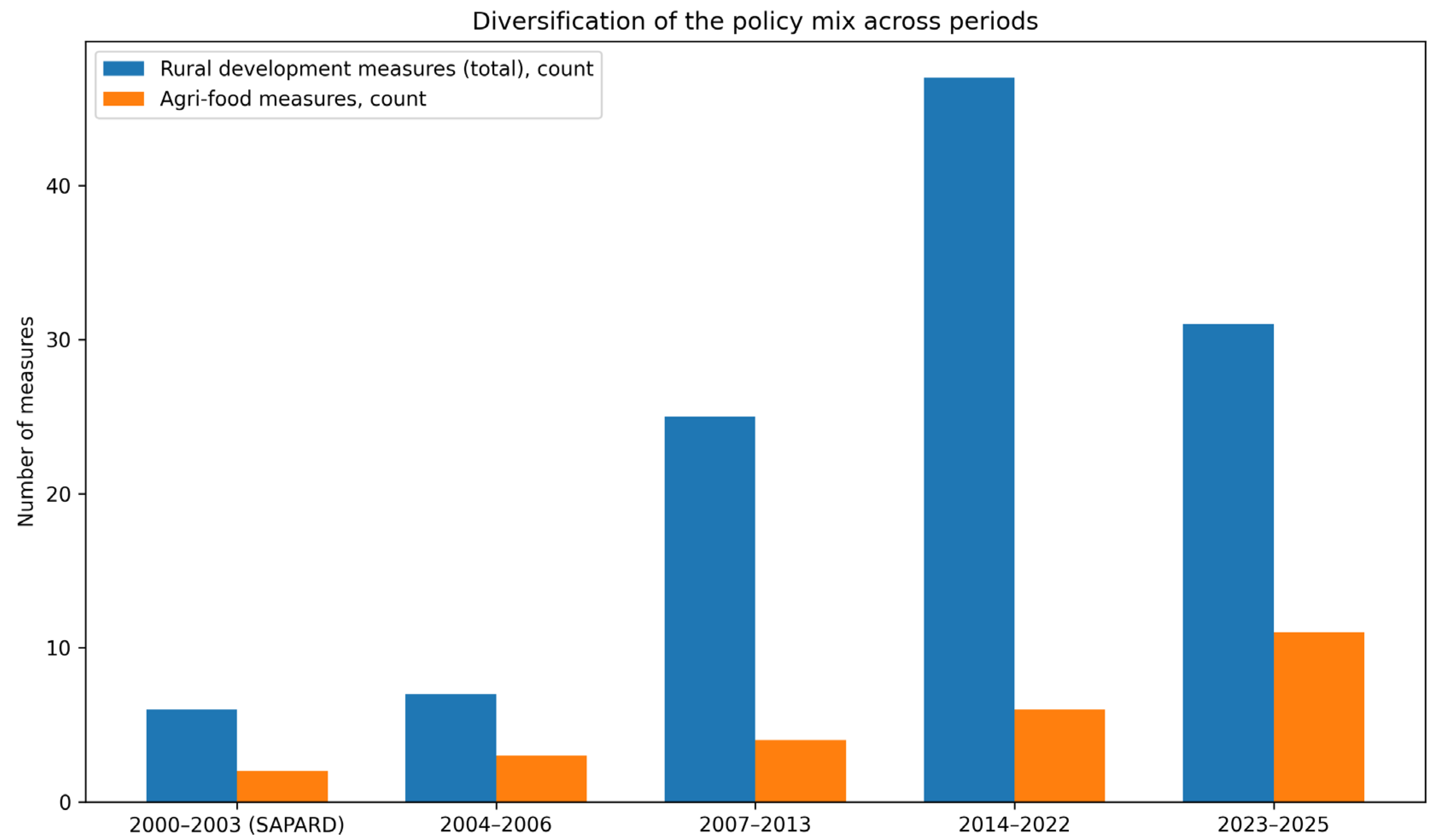 The analysis is structured around five policy phases: 2000–2003, corresponding to SAPARD and pre-accession adjustment; 2004–2006, the transitional post-accession framework; 2007–2013, the first full rural development program (RDP) cycle; 2014–2022, the second RDP cycle, including the extension through 2021–2022; and 2023–2025, the initial implementation phase of the 2023–2027 CAP Strategic Plan. These breakpoints are treated as institutionally defined policy interruptions because they correspond to formal changes in programme architecture, eligible measures, and implementation arrangements, rather than to statistically discovered turning points.