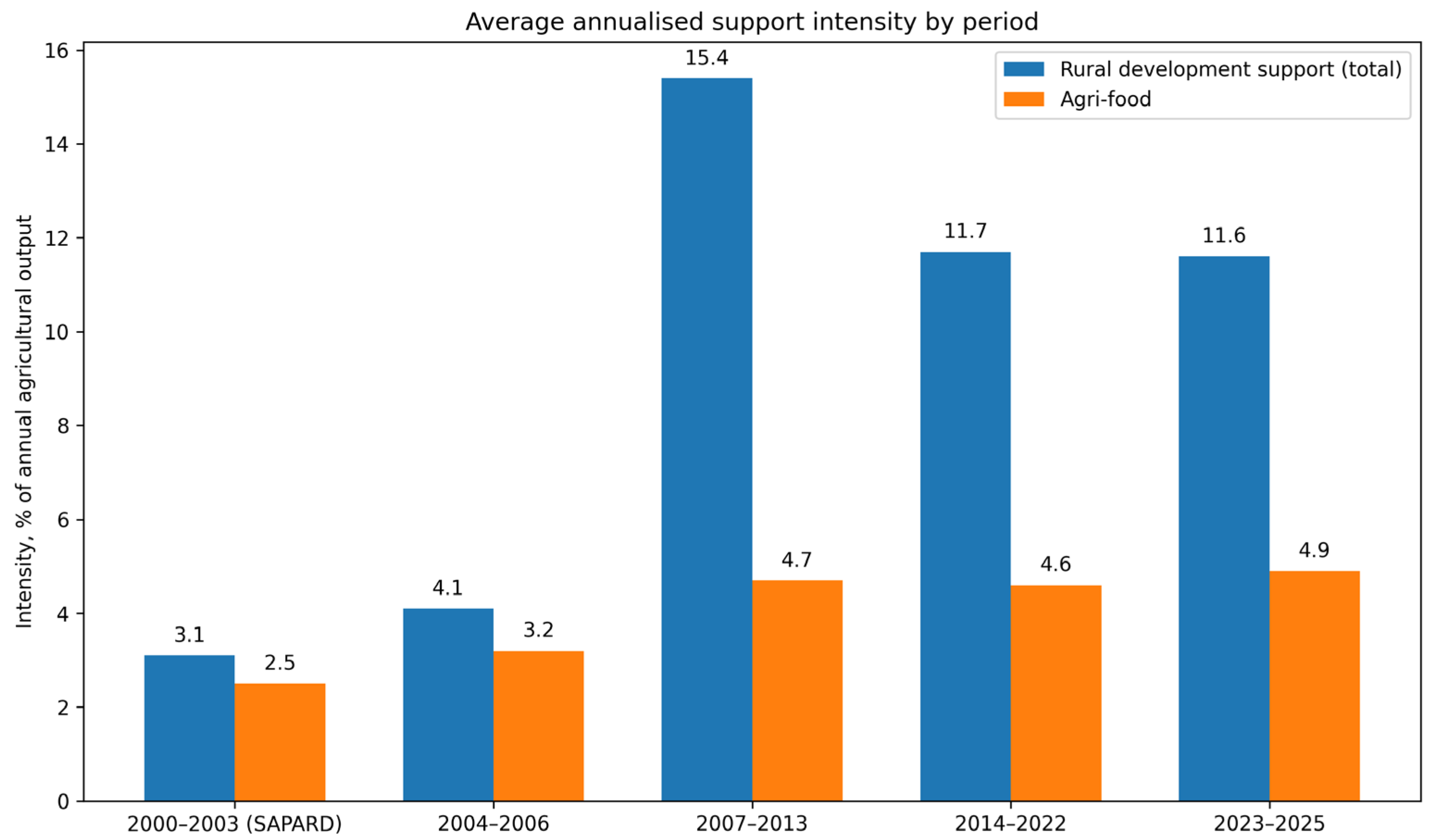 Normalizing annualized allocations by total agricultural output provides a descriptive indicator of policy scale relative to sector size. Average annualized rural development support intensity reaches its highest level in 2007–2013, at 15.4% of annual agricultural output, compared with 3.1–4.1% in the pre-accession and early post-accession phases (