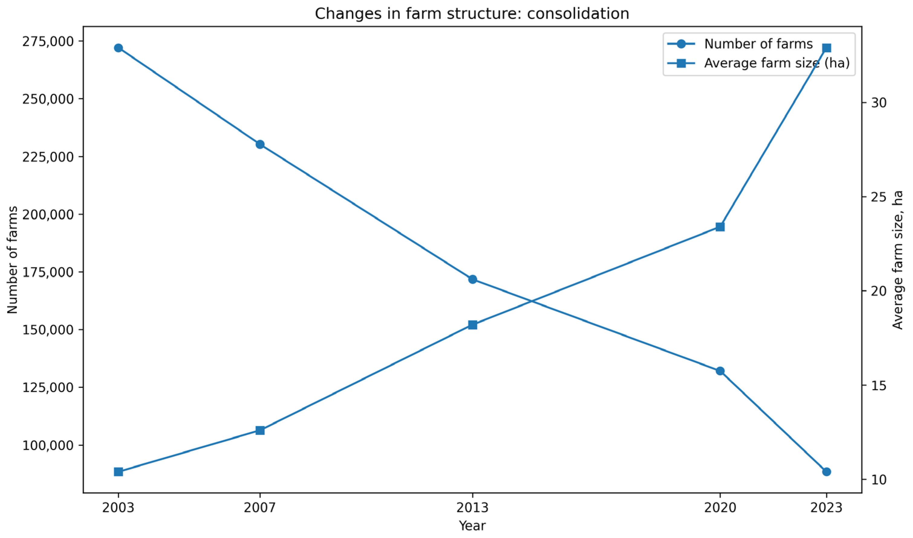 Farm-structure indicators reveal pronounced consolidation. The number of farms declined from 272,111 in 2003 to 88,425 in 2023 (−67.5%), while average farm size increased from 10.4 ha to 32.9 ha (K = 3.16; CAGR ≈ 5.93% per year). Taken together, these indicators provide strong evidence of long-run structural concentration in Lithuanian agriculture across successive CAP periods (