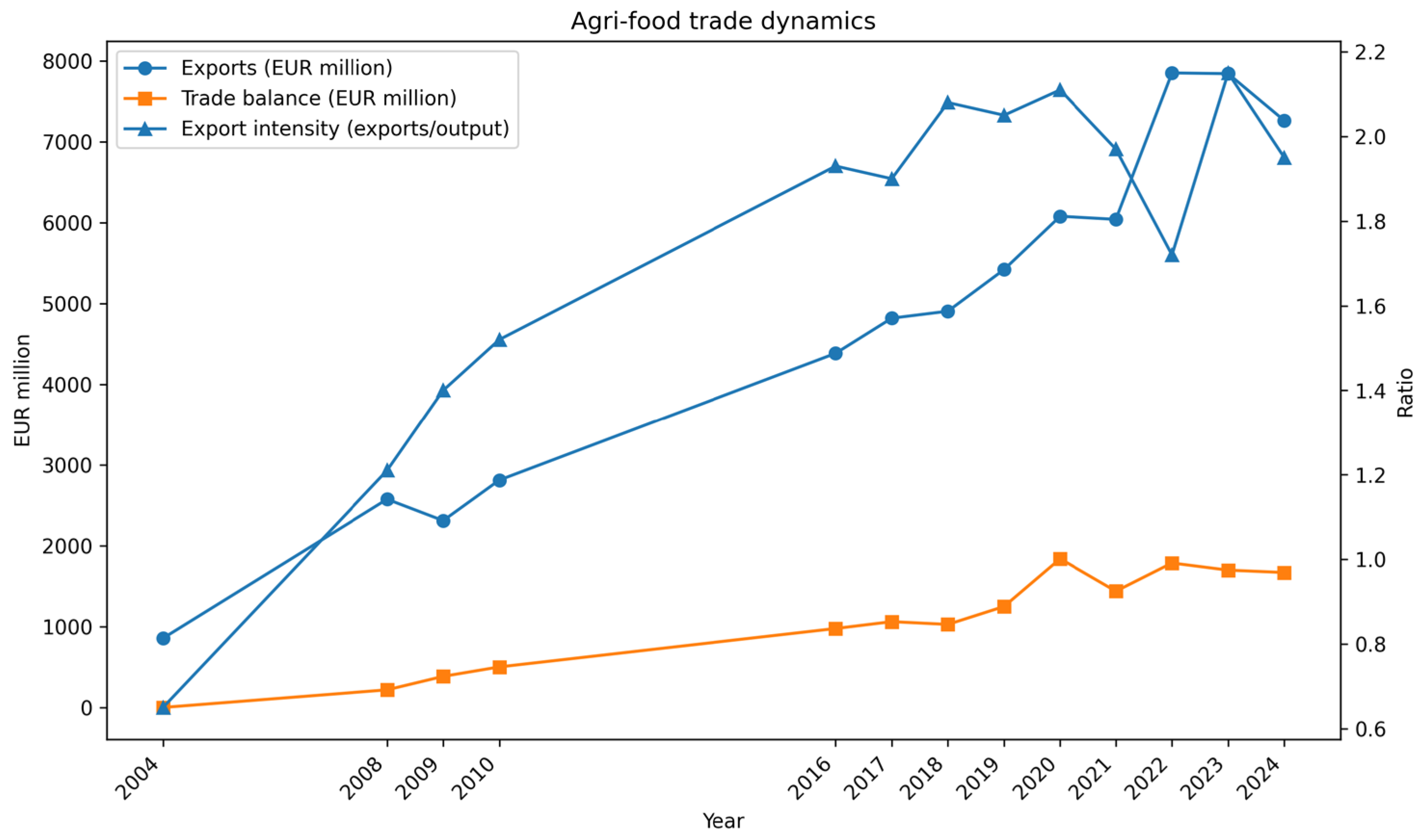 Trade indicators suggest strong market integration and value-chain expansion. Agri-food exports increased from EUR 856.3 million in 2004 to EUR 7263.4 million in 2024 (K = 8.48; CAGR ≈ 11.28% per year). Export intensity, measured as exports relative to total agricultural output, increased from 0.65 to approximately 1.95. Because exports refer to the broader agri-food sector whereas the denominator captures total agricultural output, the ratio may exceed 1 and should be interpreted primarily as a comparative proxy for trade orientation rather than as a literal output share. The trade dynamics are presented in
