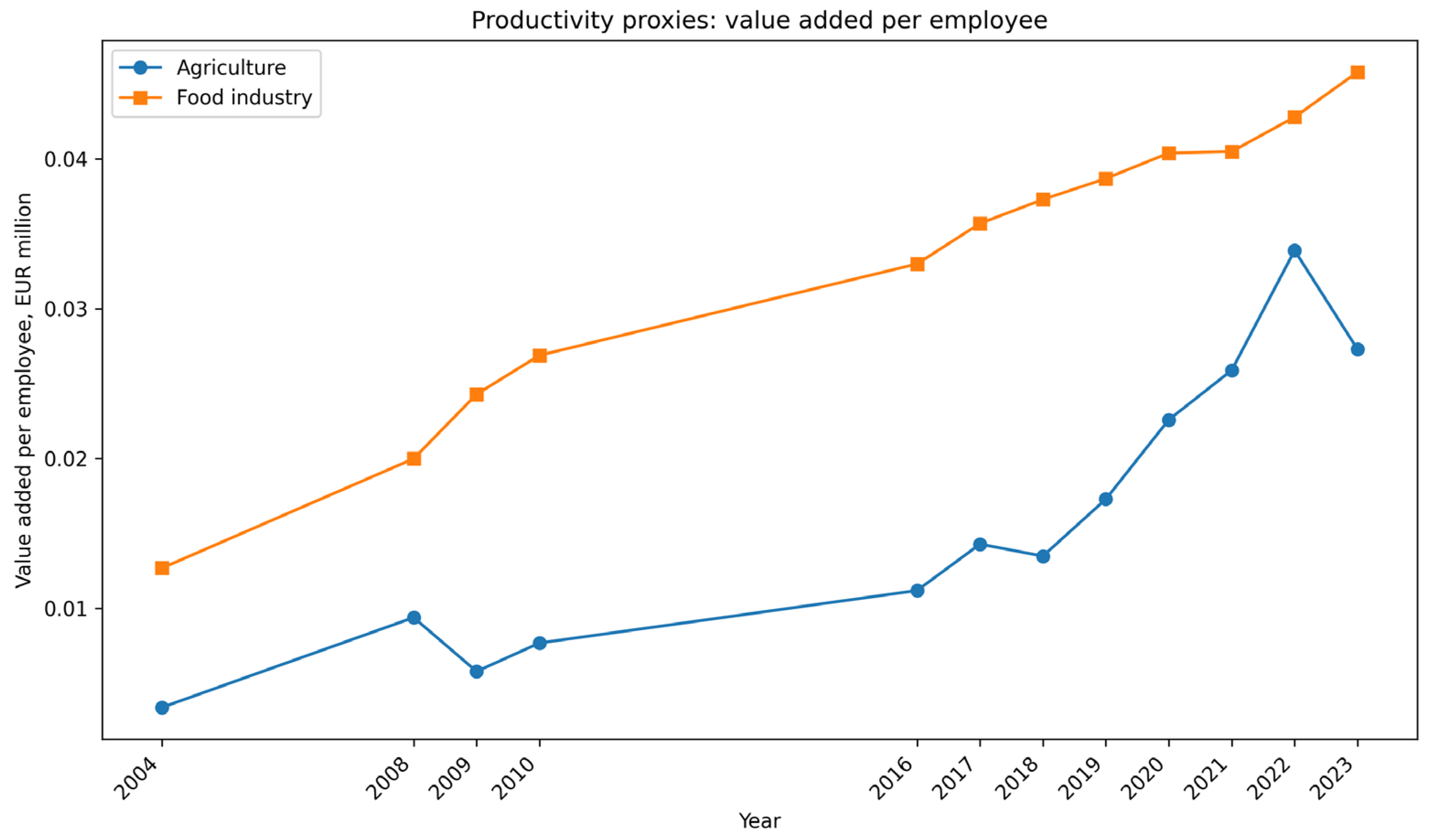 Table 8). In agriculture, the indicator rose from EUR 0.0034 million per employee in 2004 to EUR 0.0273 million in 2023 (K = 8.03; CAGR ≈ 11.59% per year), while in the food industry it increased from EUR 0.0127 million to EUR 0.0458 million (K = 3.61; CAGR ≈ 6.98% per year). The gap between the two sectors narrowed over time: in 2004, value added per employee in the food industry was 3.74 times higher than in agriculture, compared with 1.68 times in 2023. Since these indicators are reported in nominal terms, they should be interpreted as current-price productivity proxies rather than as pure measures of real labour-productivity growth independent of price effects. Nevertheless, the results suggest a relative narrowing of the productivity gap between primary agriculture and food processing. These results are summarized in