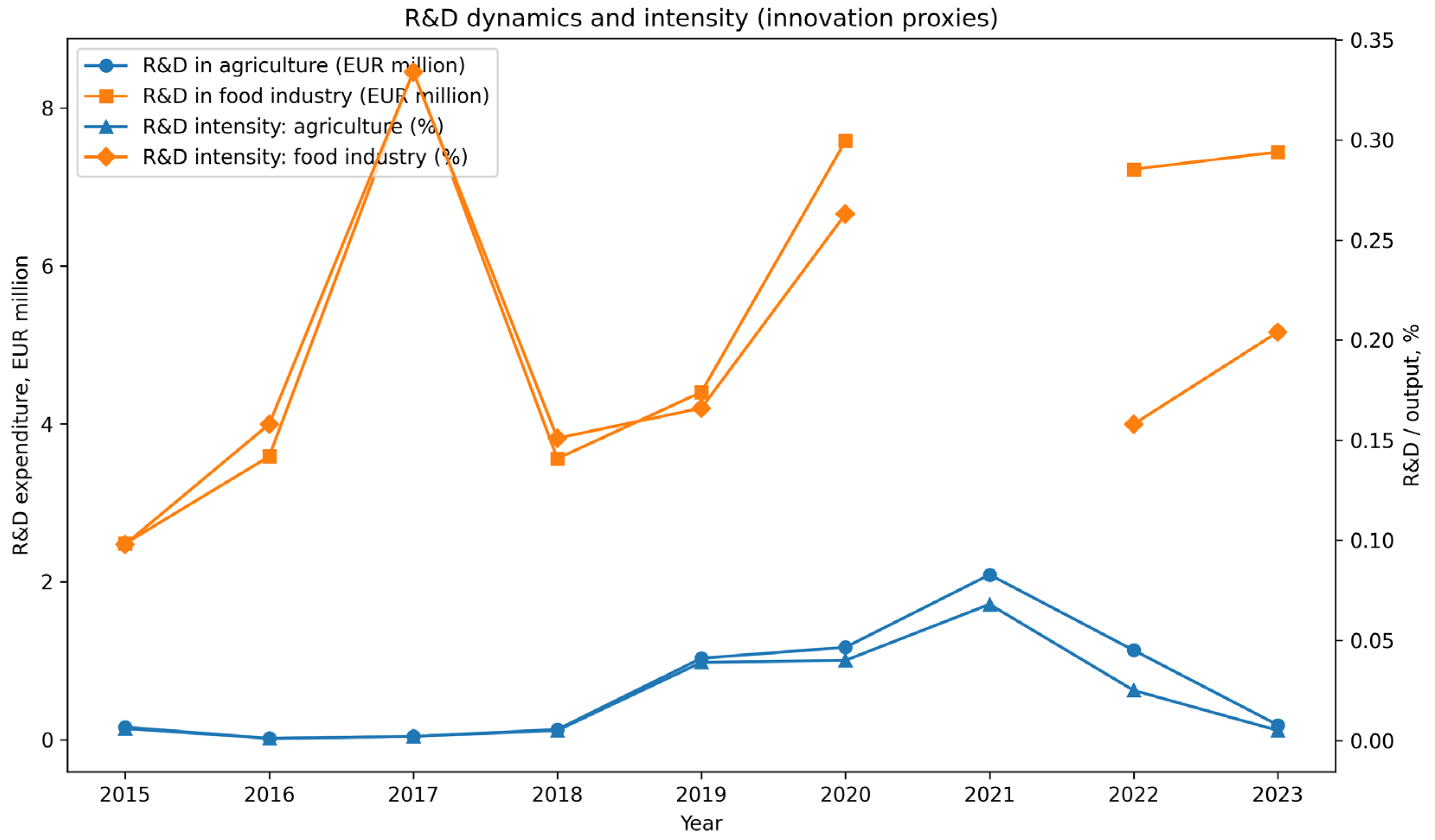 The available R&D expenditure data for 2015–2023 provide only a narrow and partial view of innovation dynamics in the agri-food sector. The recorded data show that formal R&D expenditure is more strongly concentrated in the food industry than in primary agriculture. Food-industry R&D ranges from approximately EUR 2.483 million to EUR 8.458 million, whereas agricultural R&D is substantially smaller and more volatile. Normalized R&D intensities remain below 0.1% in agriculture and below 0.35% in the food industry in the available series (