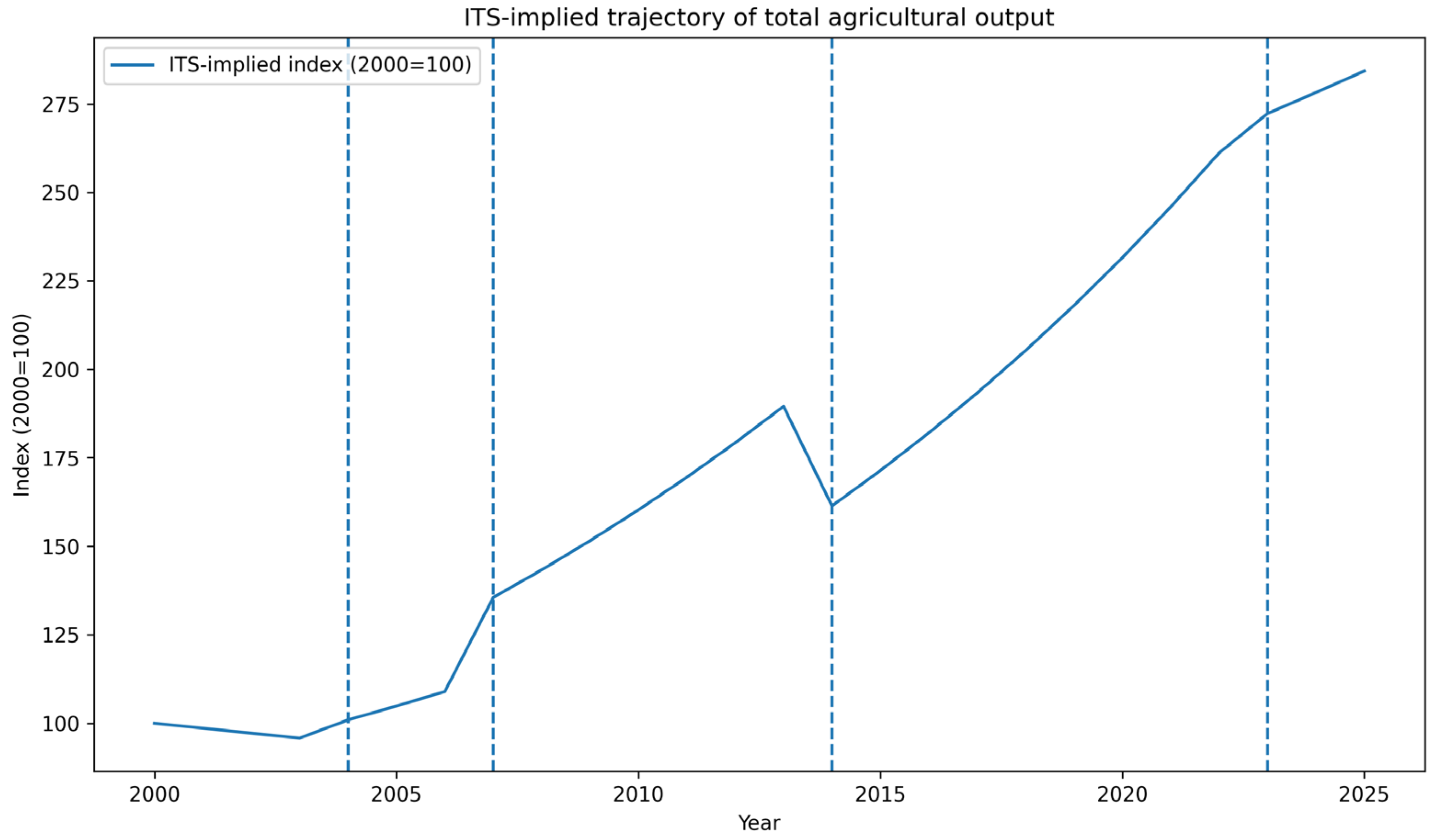 Taken together, the ITS results suggest that selected shifts in sectoral trajectories were temporally aligned with major CAP programming transitions, although the strength and direction of these associations differ across indicators. The structural interpretation is more robust for crop share than for total agricultural output, since the latter reflects both nominal price dynamics and quantity-related change.