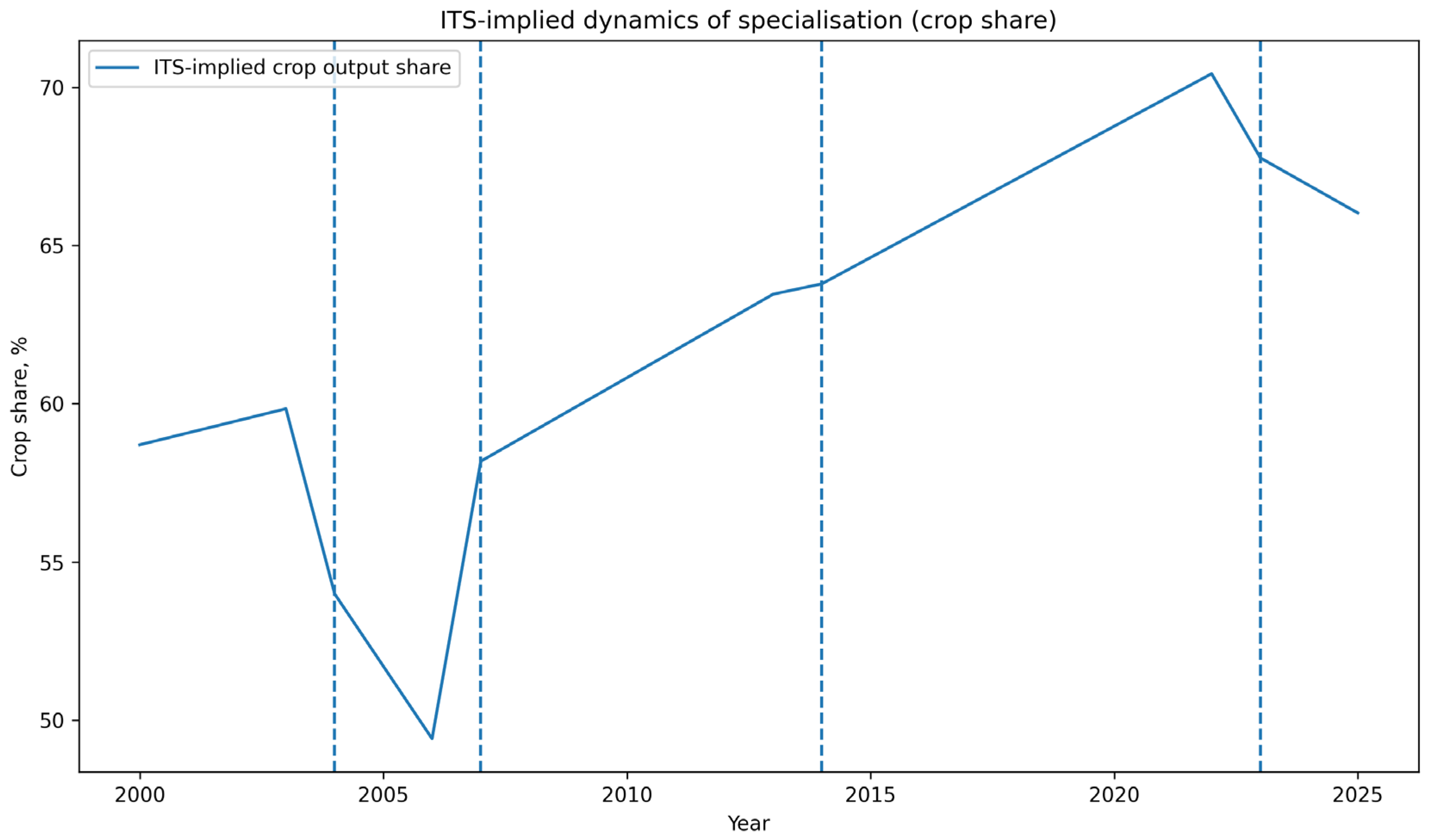 A break-year snapshot for 2000, 2007, 2014, and 2025 illustrates how changes in output composition occurred alongside stepwise changes in annualized support volumes after major policy transitions. In this sense, the descriptive evidence is consistent with a gradual strengthening of crop-oriented specialization, although it does not by itself establish a causal relationship between support and output dynamics. The relevant break-year values are reported in