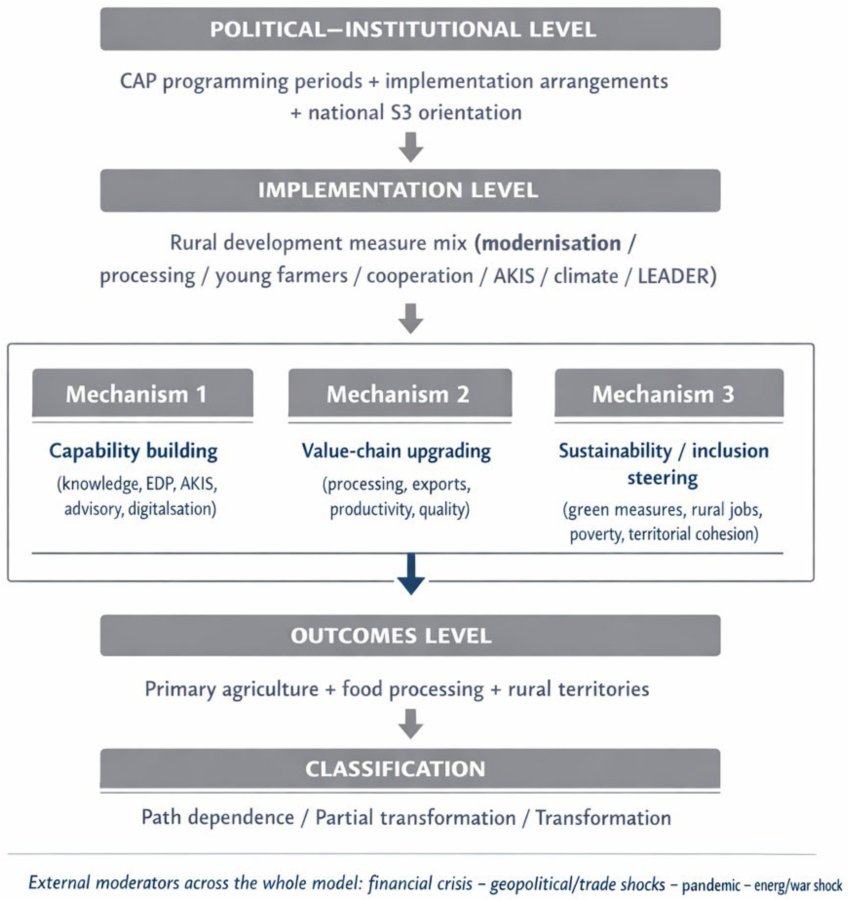 Synthesizing the three lenses above, we operationalize sector transformation through a three-level analytical model. At the political–institutional level, the model captures changes across CAP programming periods and their implementation arrangements, together with the orientation of agri-food-relevant innovation priorities (including S3). At the implementation level, it focuses on the rural development measure mix, defined as the set of measures available in each period and the allocation of budgets across intervention types. At the outcomes level, it evaluates whether the sector’s observed trajectory is consistent with structural transformation and upgrading.