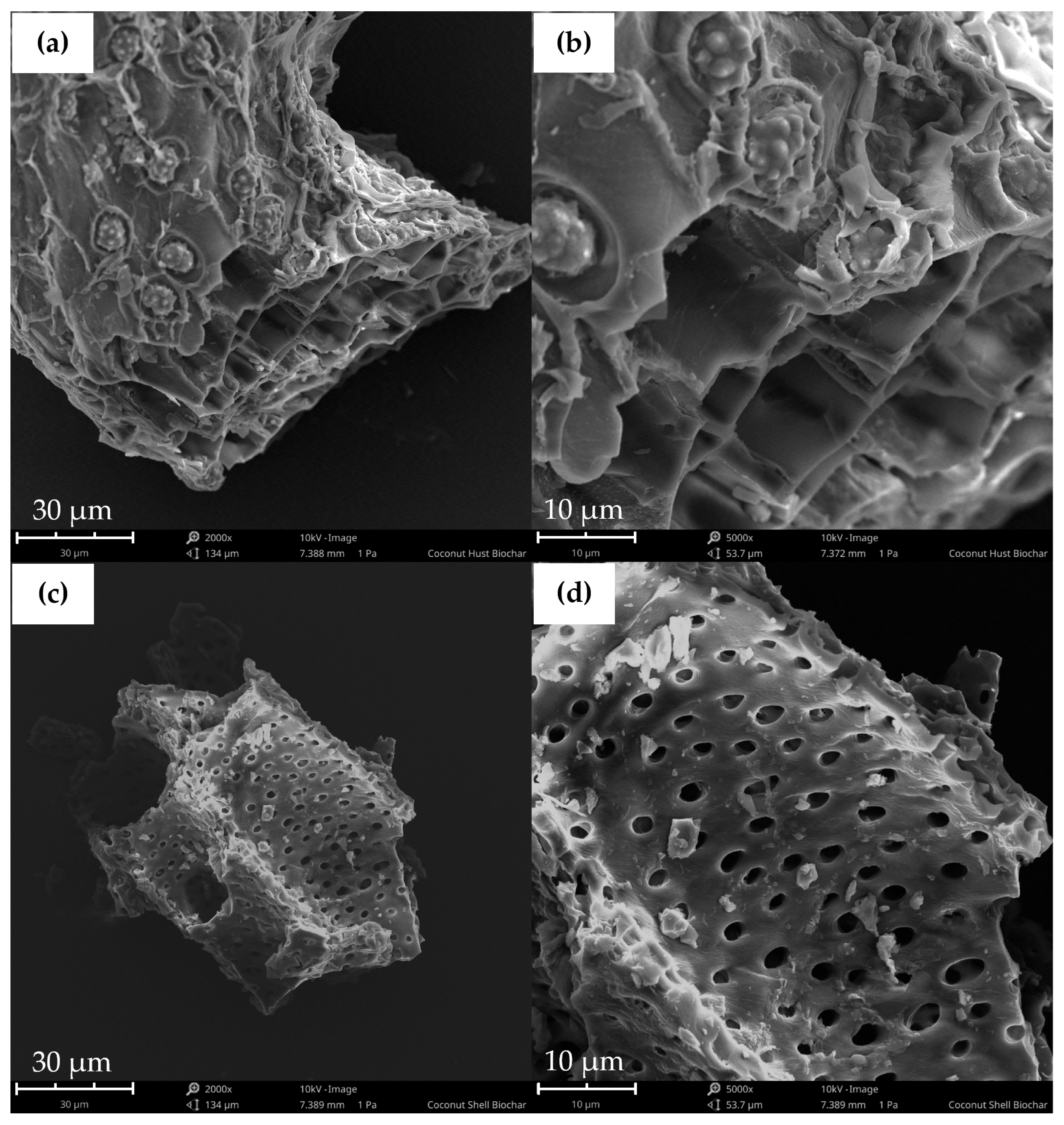 - Suman, S.; Gautam, S. Pyrolysis of coconut husk biomass: Analysis of its biochar properties. Energy Sources Part A 2017, 39, 761–767. [Google Scholar] [CrossRef]