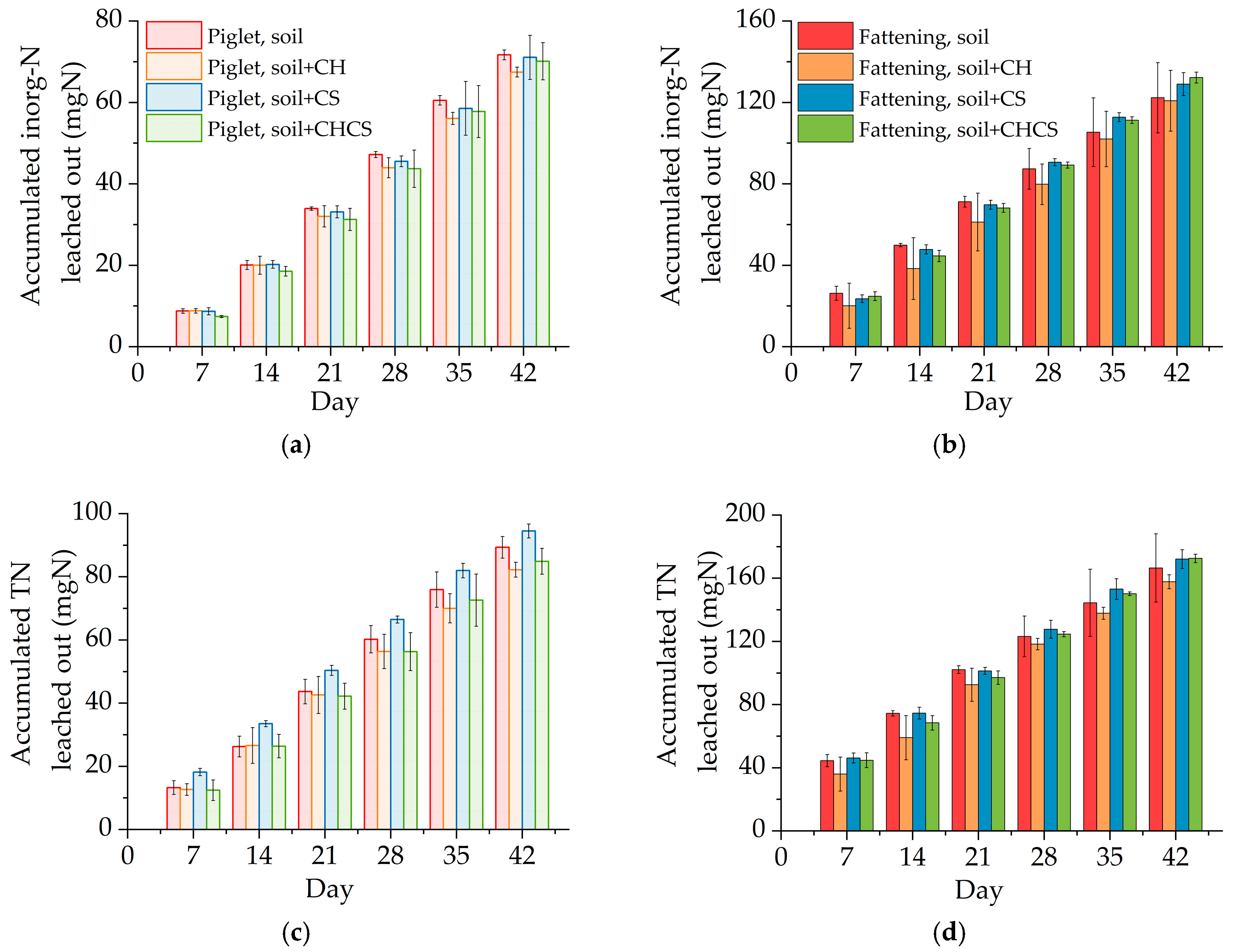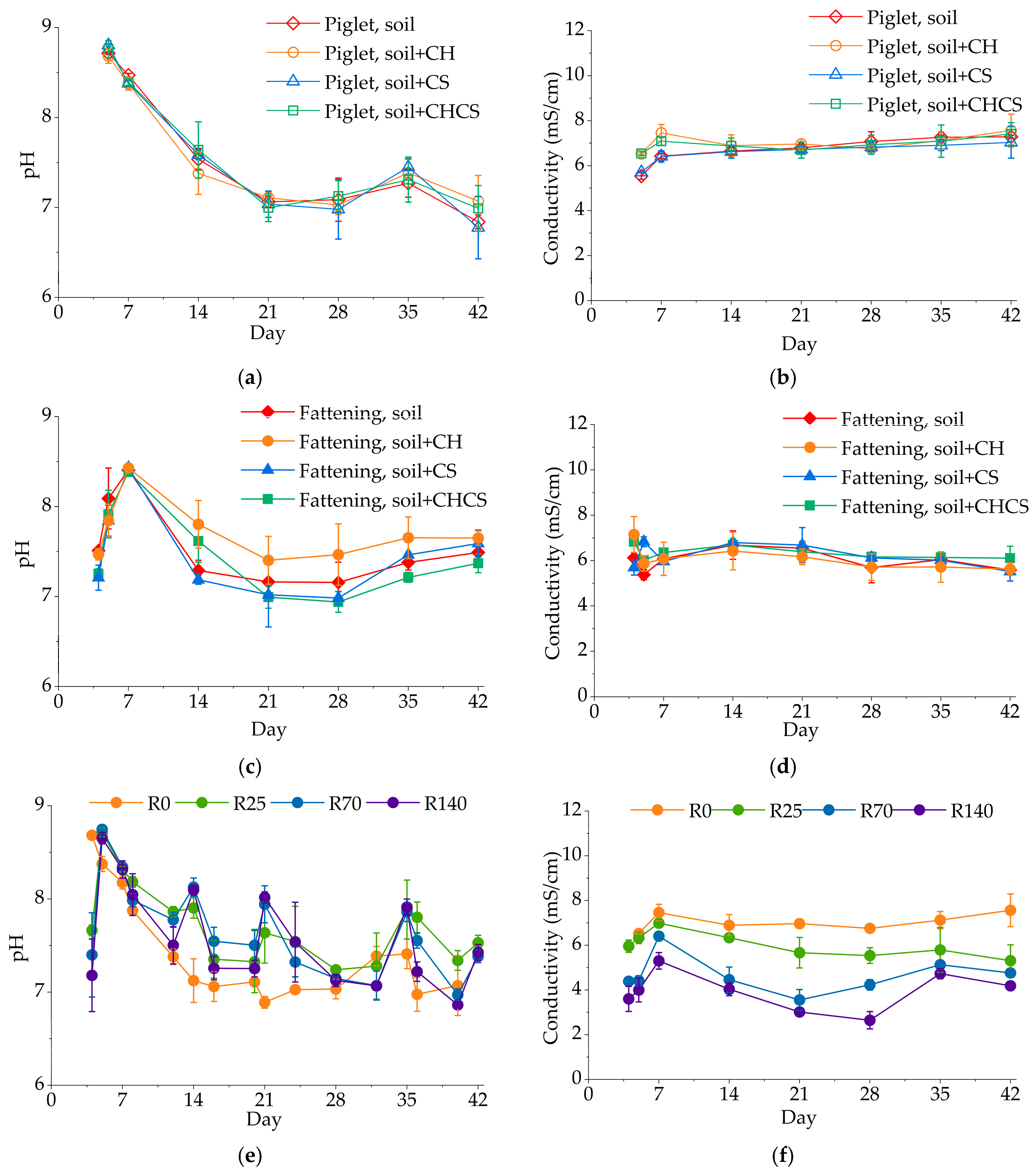 | Loaded soil + CHCS | 42 | piglet | 6.61 ± 0.22 d | 0.71 ± 0.08 b | 0.77 ± 0.12 b | 51 ± 9 c | 92 ± 41 c | 7833 ± 943 c | 1.0 ± 0.3 b | 1.3 ± 0.5 a | 731 ± 147 b |