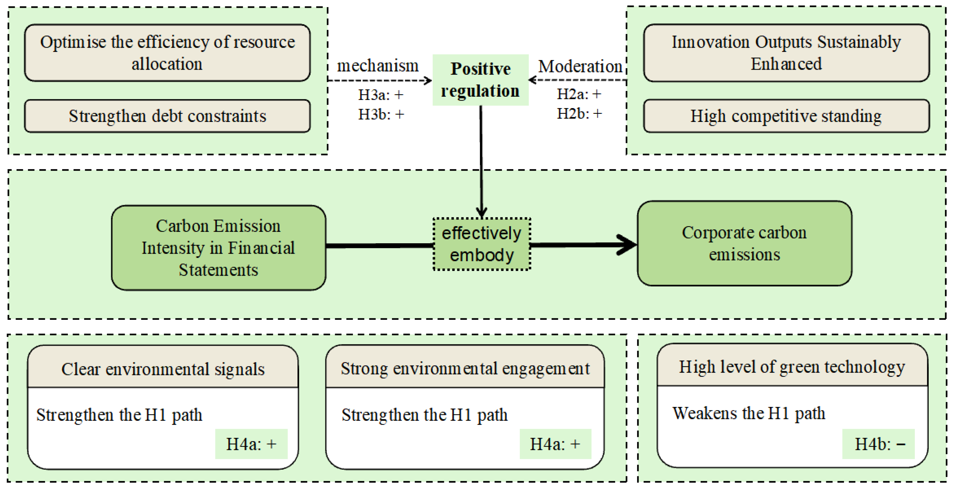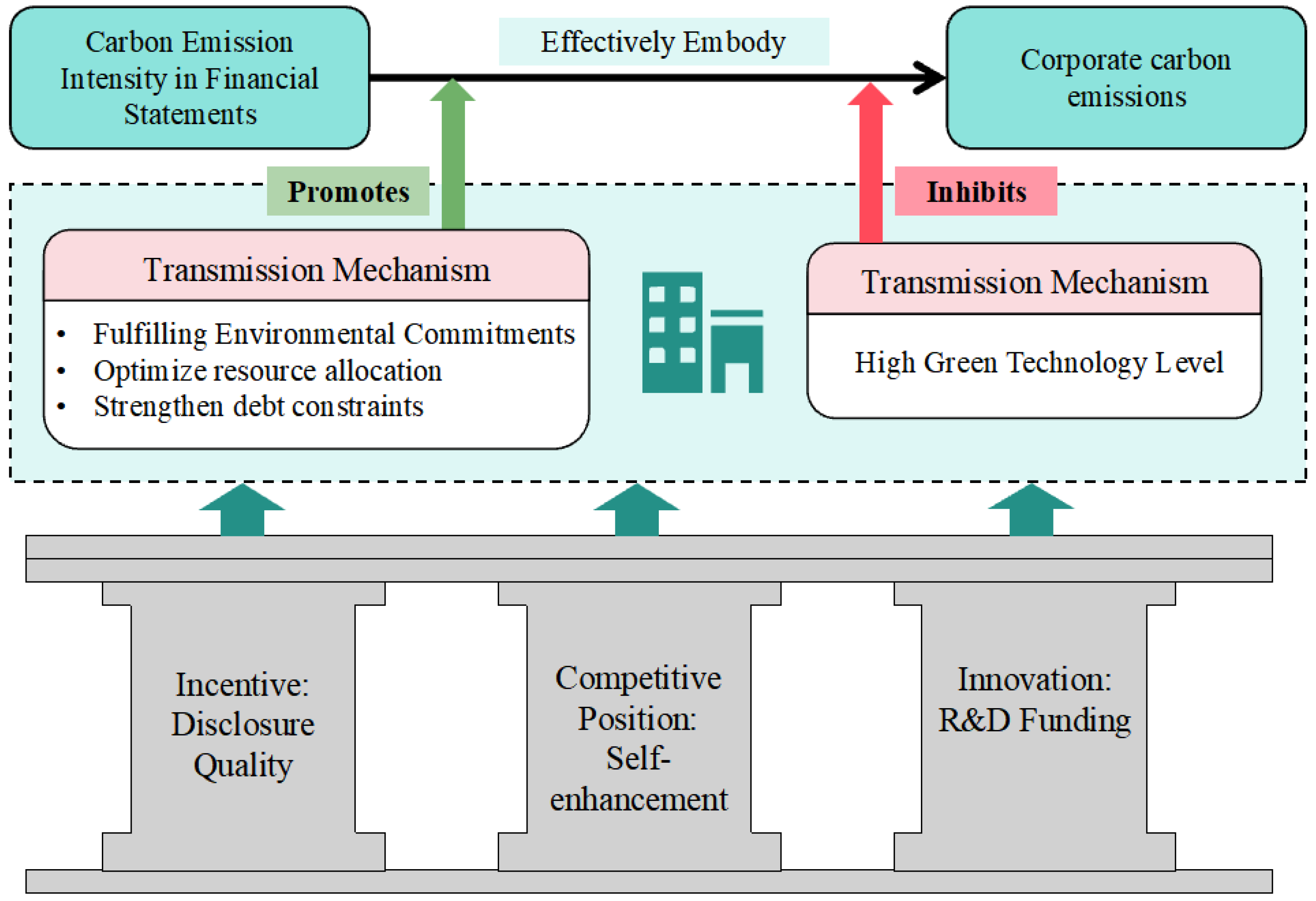 - This study introduces moderating factors: the sustainability of corporate innovation outputs and the competitive position of enterprises strengthen the positive relationship between corporate carbon emission intensity and corporate carbon emissions. That is, the higher the levels of these two factors, the more effectively carbon emission intensity reflects the actual corporate carbon emissions of enterprises.