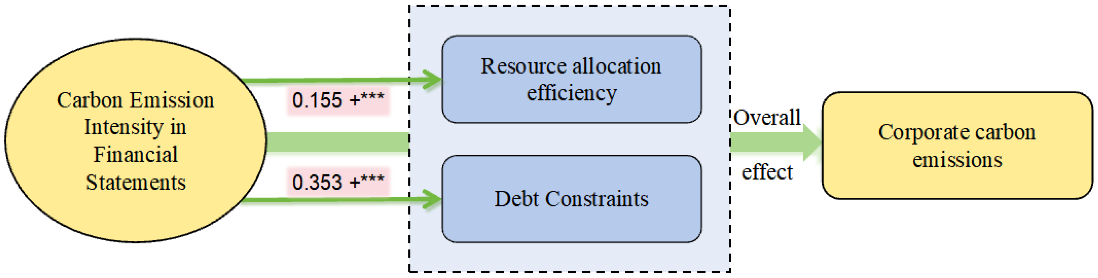 - This study validates two mechanisms—enterprise resource allocation efficiency and financing constraints—as partially mediating the relationship between carbon emission intensity and corporate carbon emissions. It explains how carbon emission intensity reflects actual corporate carbon emissions through resource allocation efficiency and financing constraints.