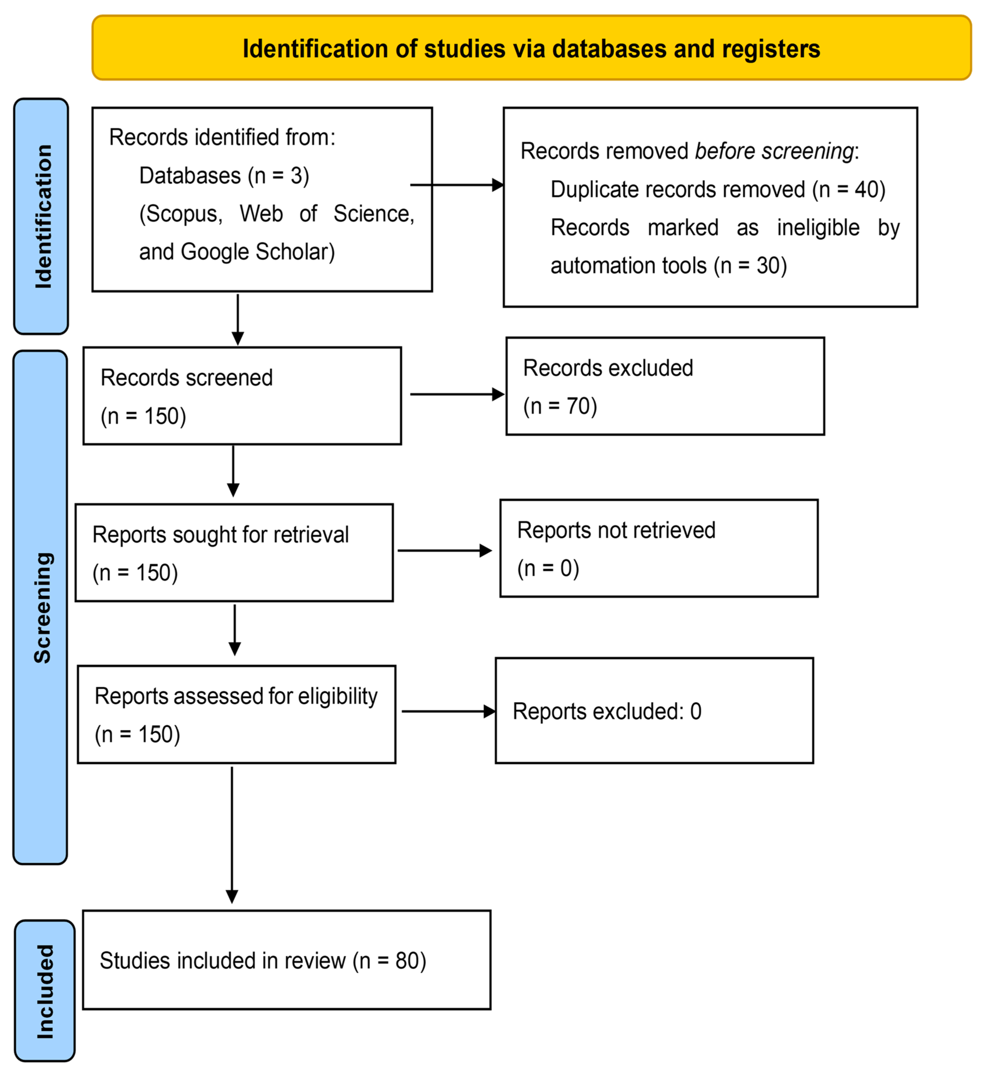18]. Inclusion criteria comprised (i) studies addressing hydrogen production technologies, costs, environmental impacts, or policy frameworks; (ii) explicit relevance to Sub-Saharan Africa or applicability to emerging and developing energy systems; and (iii) publication in peer-reviewed outlets or reputable institutional reports. Exclusion criteria included studies lacking technical or economic relevance, purely conceptual opinion pieces, or works focused exclusively on high-income regions without transferable insights. The initial search yielded 150 records, which were screened based on title and abstract. After removing duplicates and non-relevant studies, 80 articles were retained for full-text analysis [