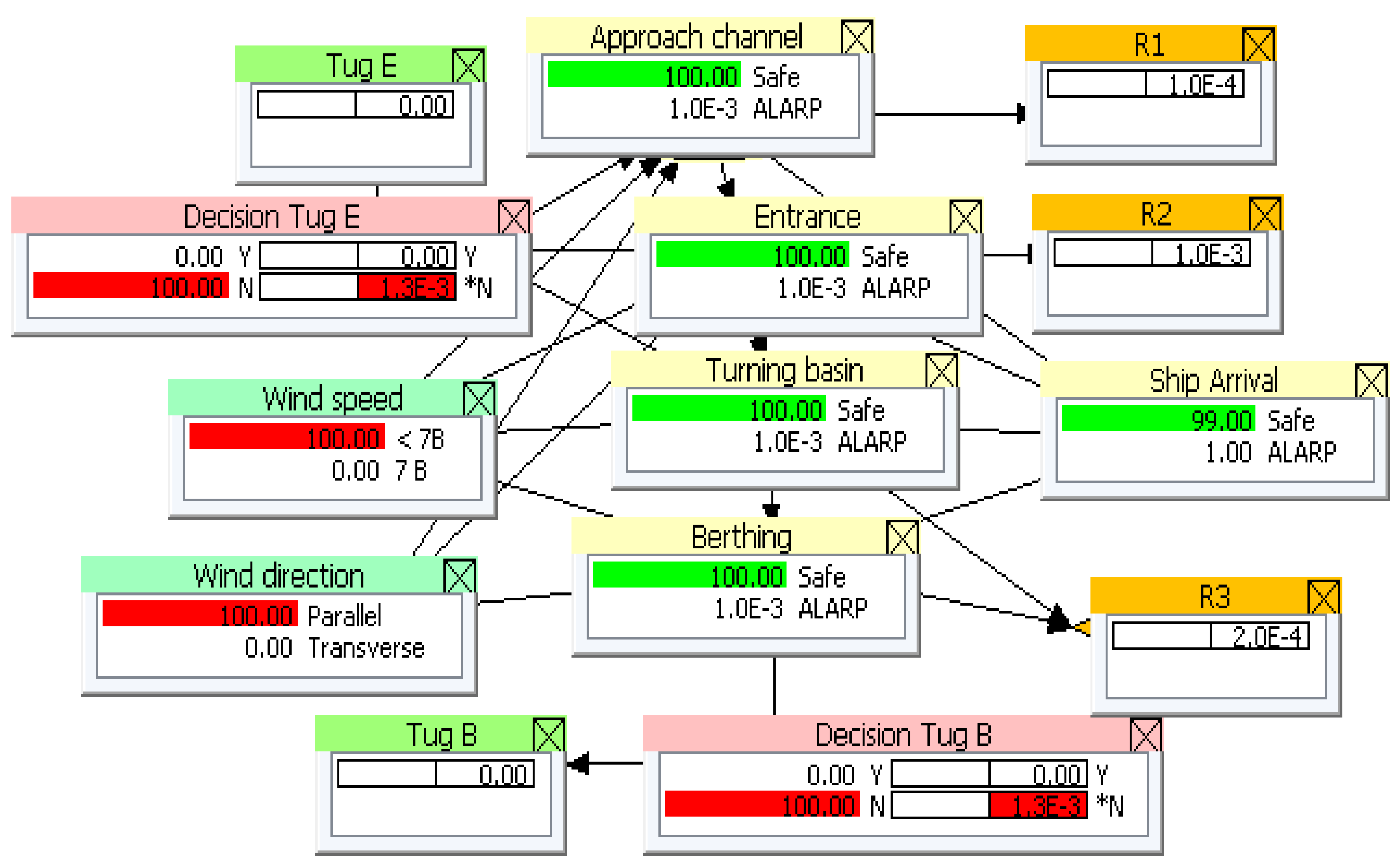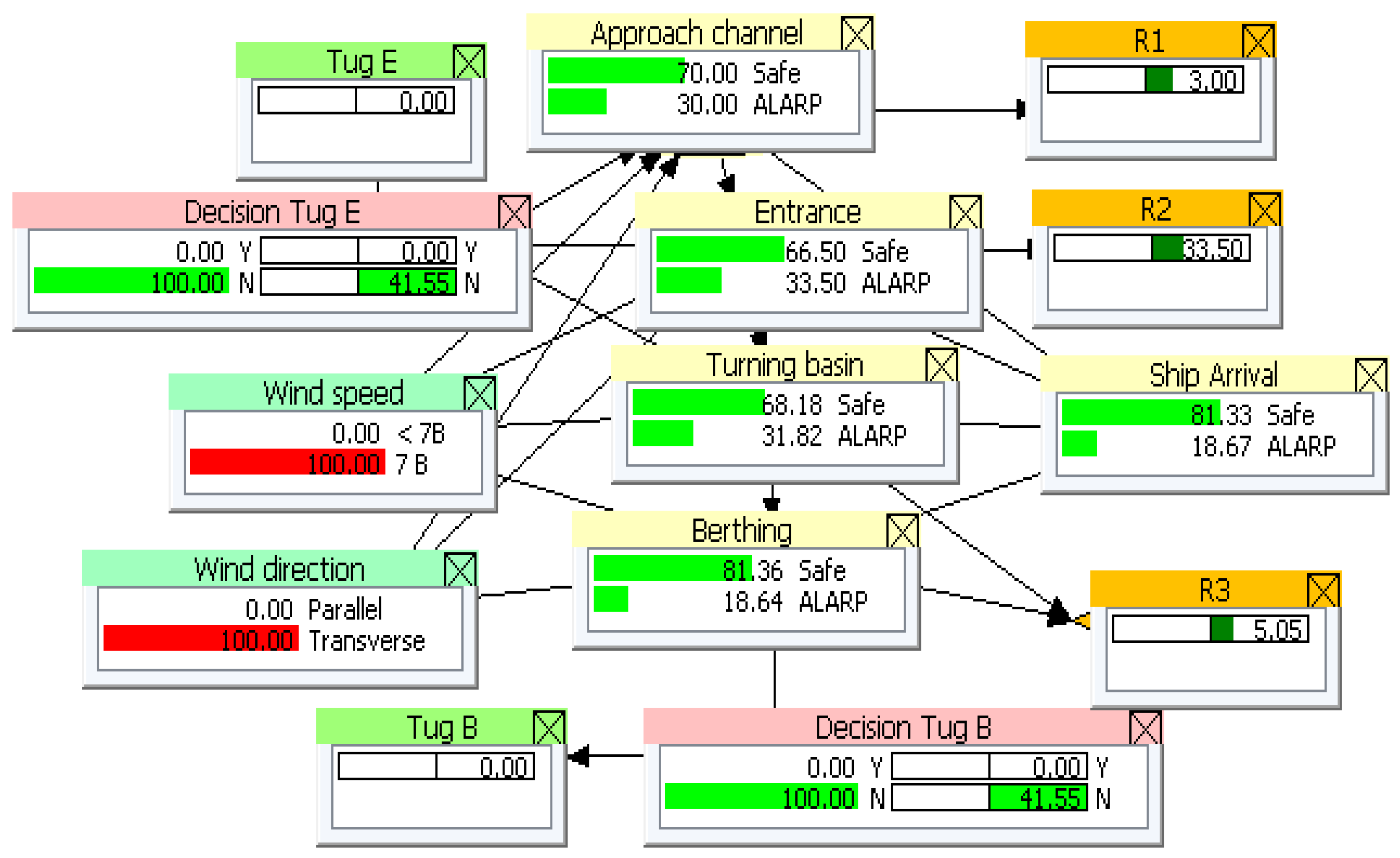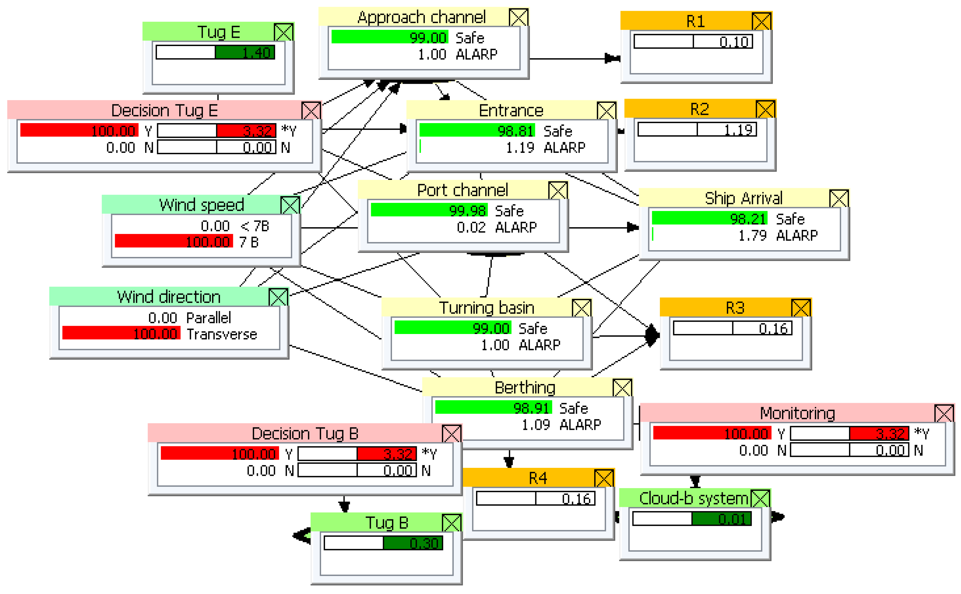 To determine the risk of port infrastructure failure, considering the impact of weather conditions and possible risk mitigation measures, including tugboats assistance and monitoring of propeller jets velocities, a Bayesian influence diagram was proposed.