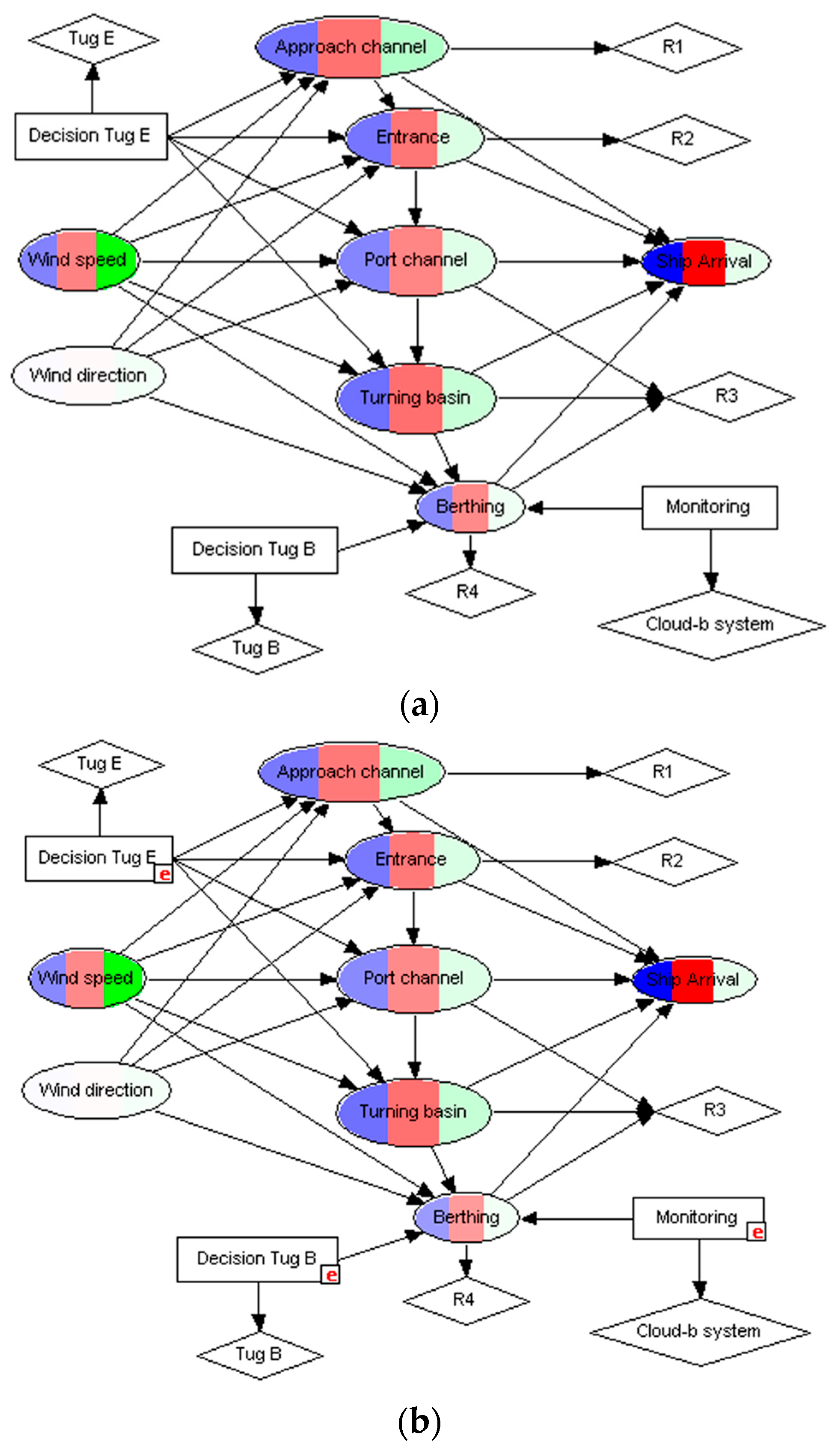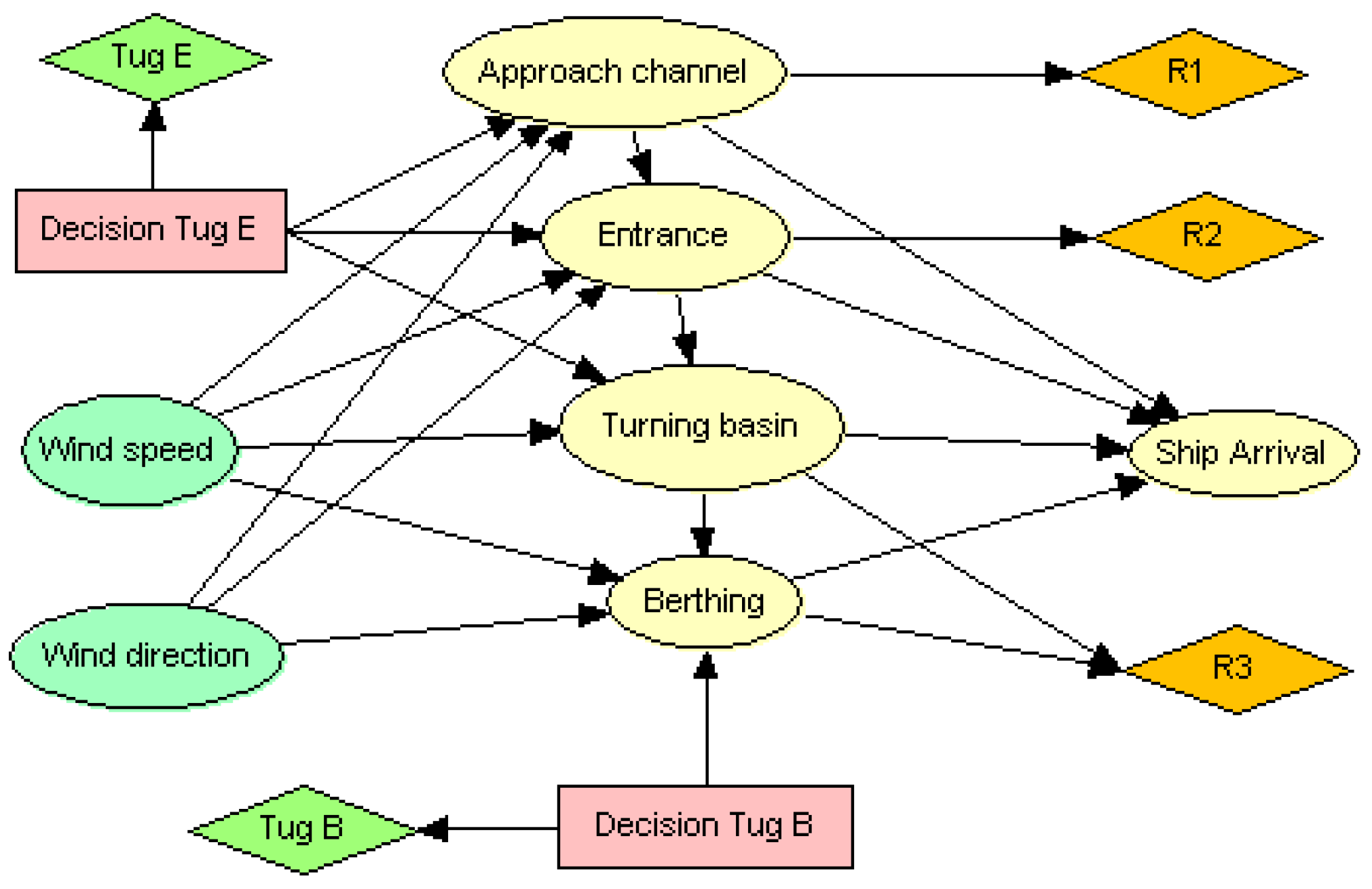 26]. The random variables (chance nodes) corresponding to subsequent states of the system—ship, port infrastructure, environment—are defined as vessel navigation along the approach fairway, passage through the port entrance, navigation along the port channel, turning in the turning basin, and mooring. The conditional probability of port infrastructure failure in the given state is computed based on the probabilities of failure in the previous states, considering wind conditions and decisions on the application of risk mitigation measures.