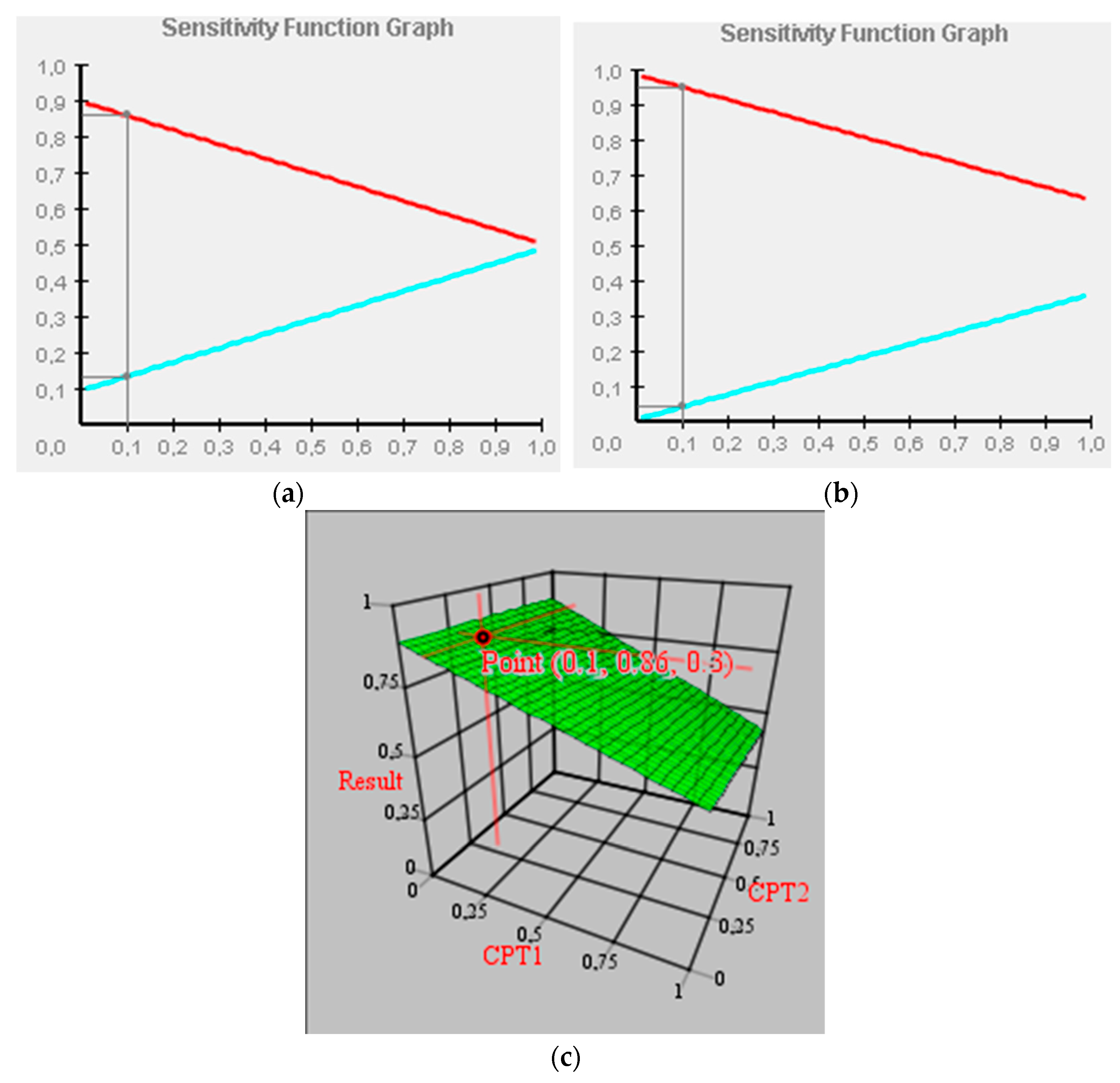 where α, β, γ, δ and are the numeric constants that shape the function relating a model’s parameter to a specific inference result, allowing the sensitivity tool to compute, the maximum, average and minimum sensitivity values for each node, displayed in blue, red, and green in the Hugin tool. The sensitivity values for each node for hypothesis variable ship arrival and parameter variable wind speed is presented in