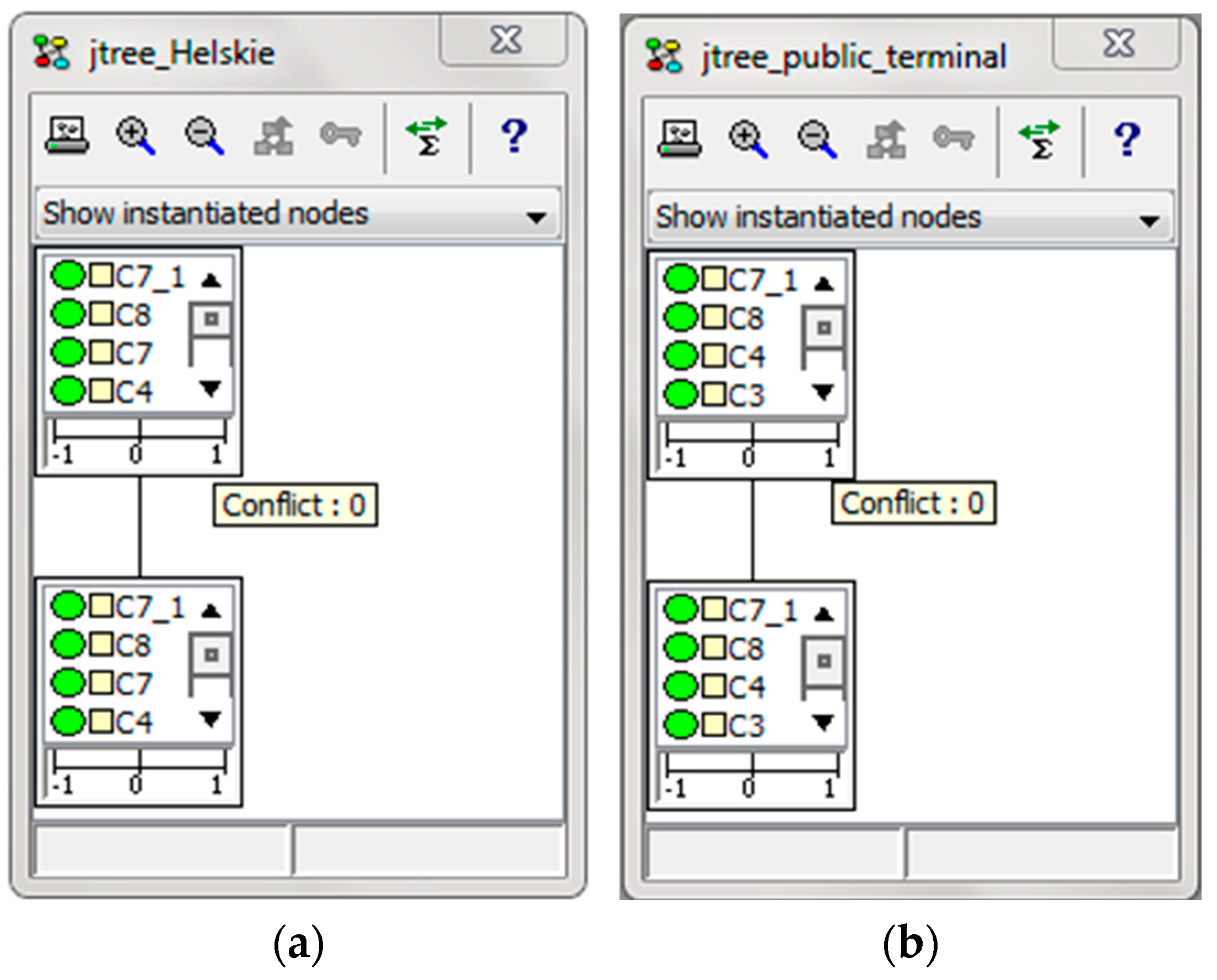 The conditional probabilities of transitions between system states were assumed based on expert opinion. The experts were experienced ship captains and scientists from the Gdynia Maritime University, who had previously conducted a number of navigational analyses for the Port of Gdynia. Two experts were involved in the design of the monitoring system at the ferry terminal. The experts were able to conduct maneuvers at the Port of Gdynia using the SimFlex Navigator 4.0 ship-handling simulator, in various wind conditions, to assess the safety of maneuvers. The experts’ opinions were not weighted due to their similar experience and high degree of consensus. The method used was brainstorming.