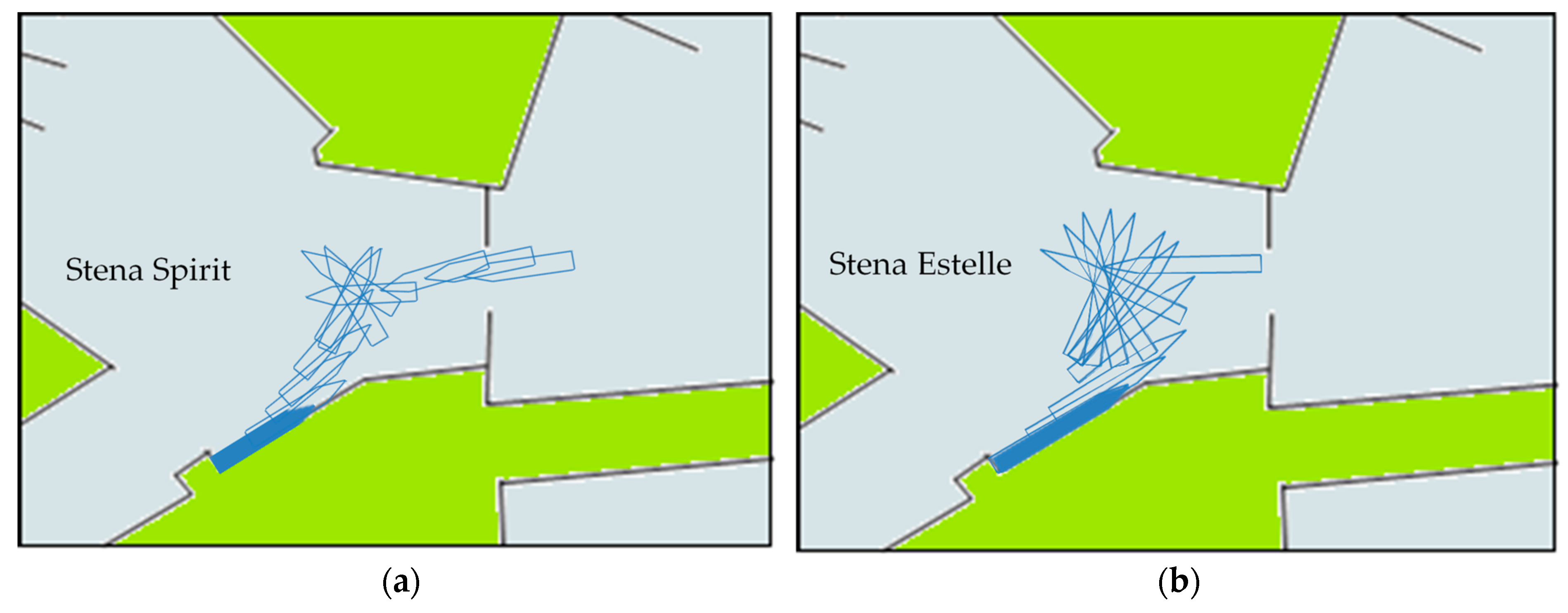 Figure 2b shows Stena Spirit being unberthed from the Helskie II quay with her actual positions recorded by AIS (Automatic Identification System) [