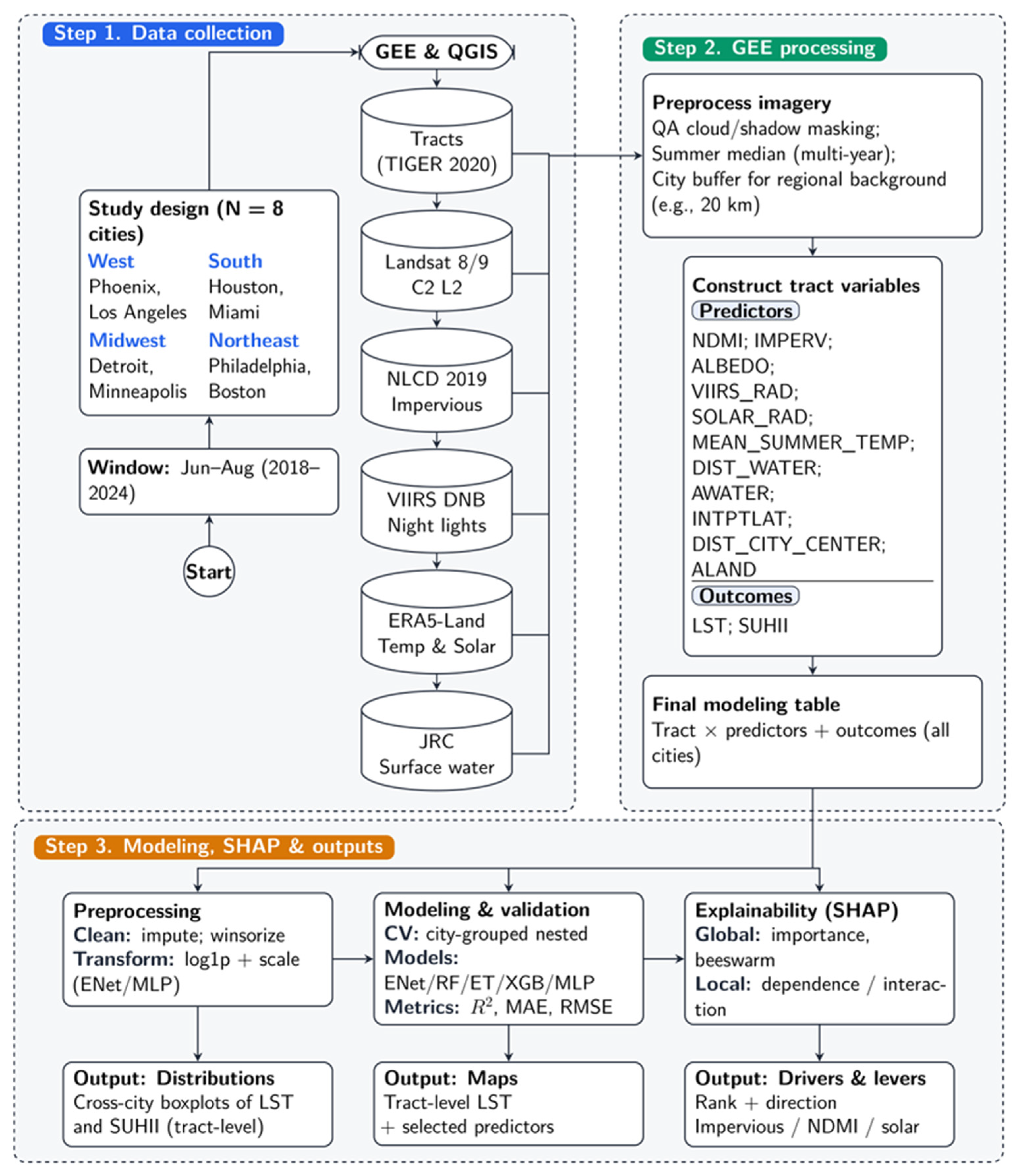 | Present study | 8 U.S. cities, tract scale | LST and SUHII | Multiple machine-learning models + nested city-held-out CV + SHAP | Separated absolute surface heat from relative within-city thermal anomaly within a standardized tract-scale cross-city framework |