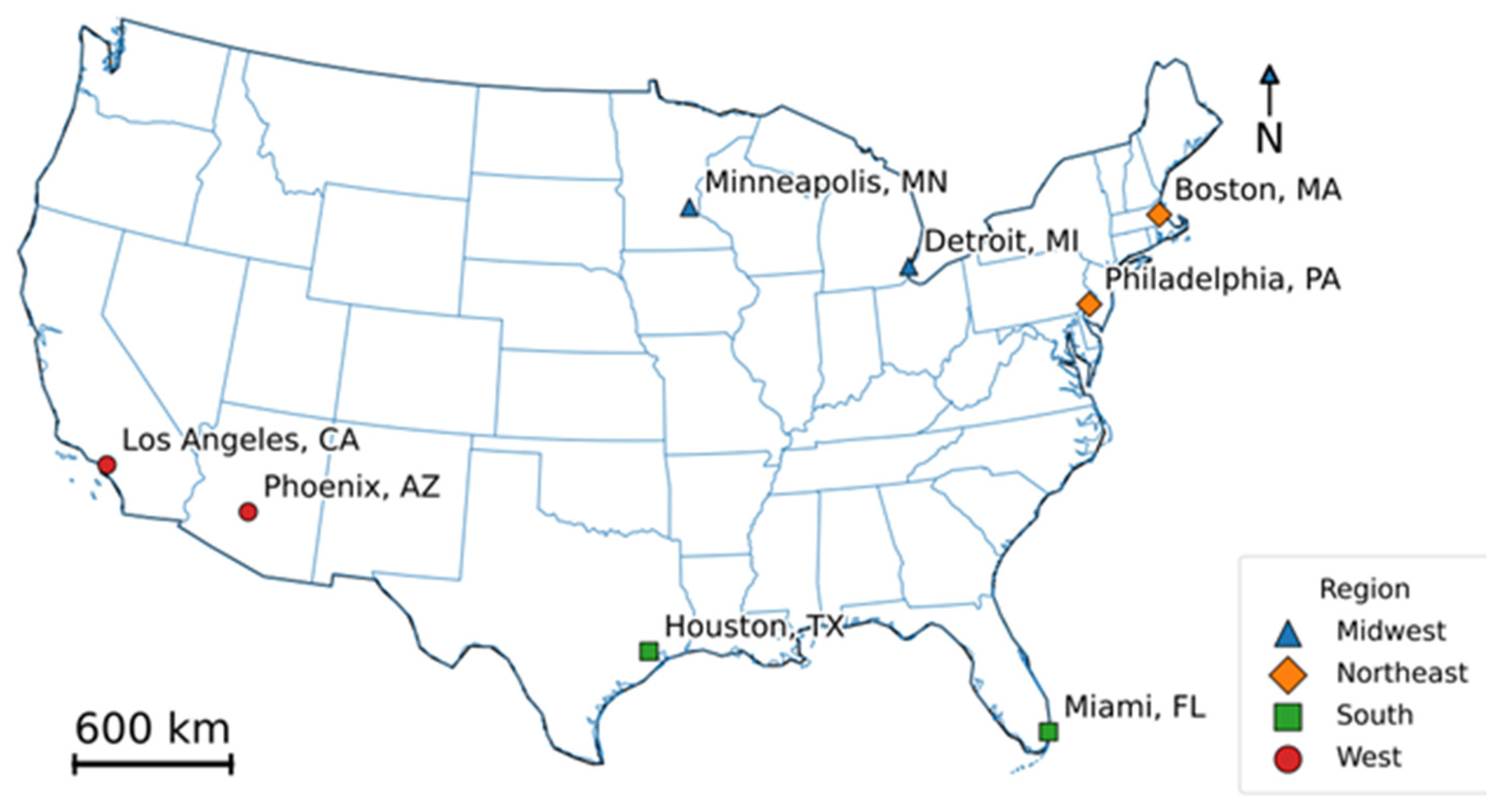 | Northeast | Philadelphia, PA: A dense city where heat exposure is highest in heavily built areas and reduced where tree canopy and street shading are present [26] | Boston, MA: Dense urban areas are warmer than surrounding regions due to impervious surfaces and reduced evapotranspiration, with the urban heat island strongest during summer [27] |