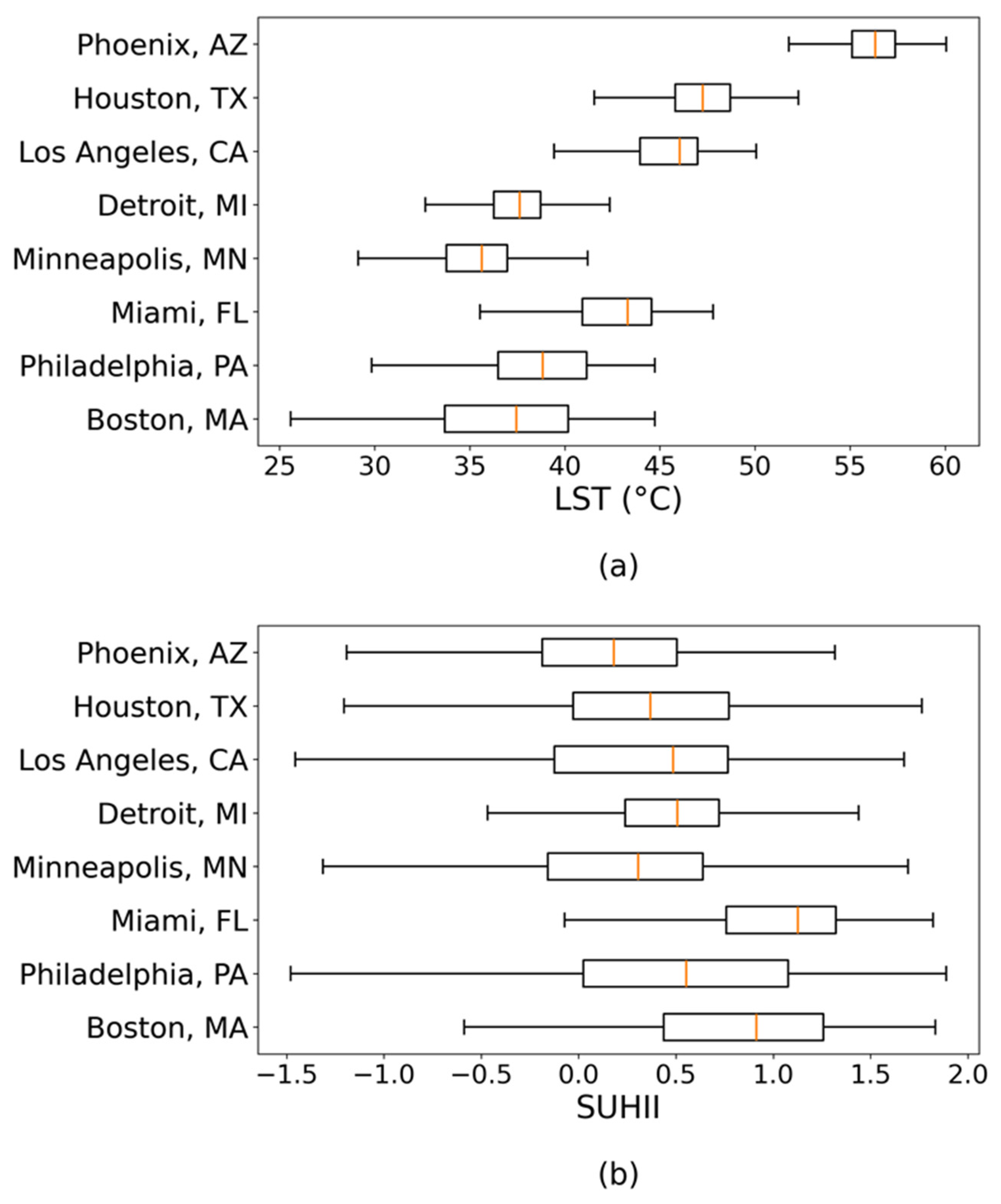 3.1. Cross-City Distributions of Tract-Level LST and SUHII