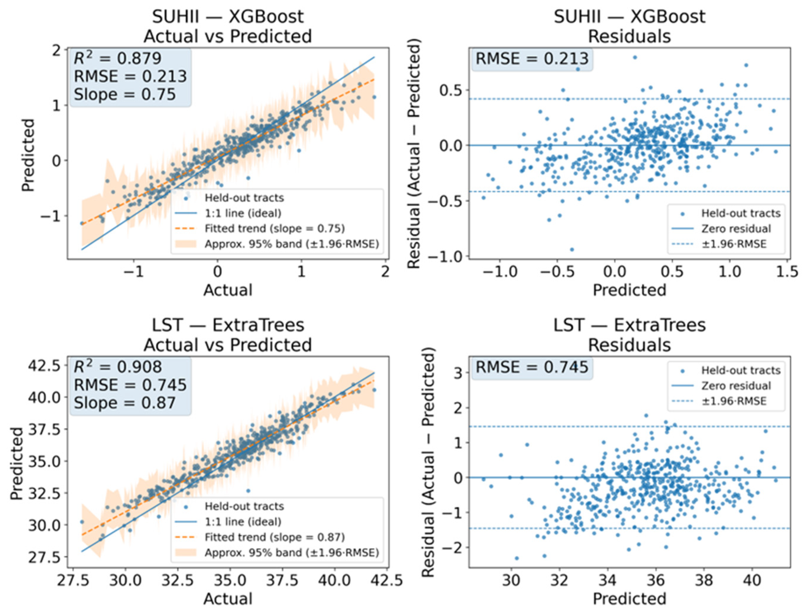3.4. Comparative Performance of the Models for SUHII and LST