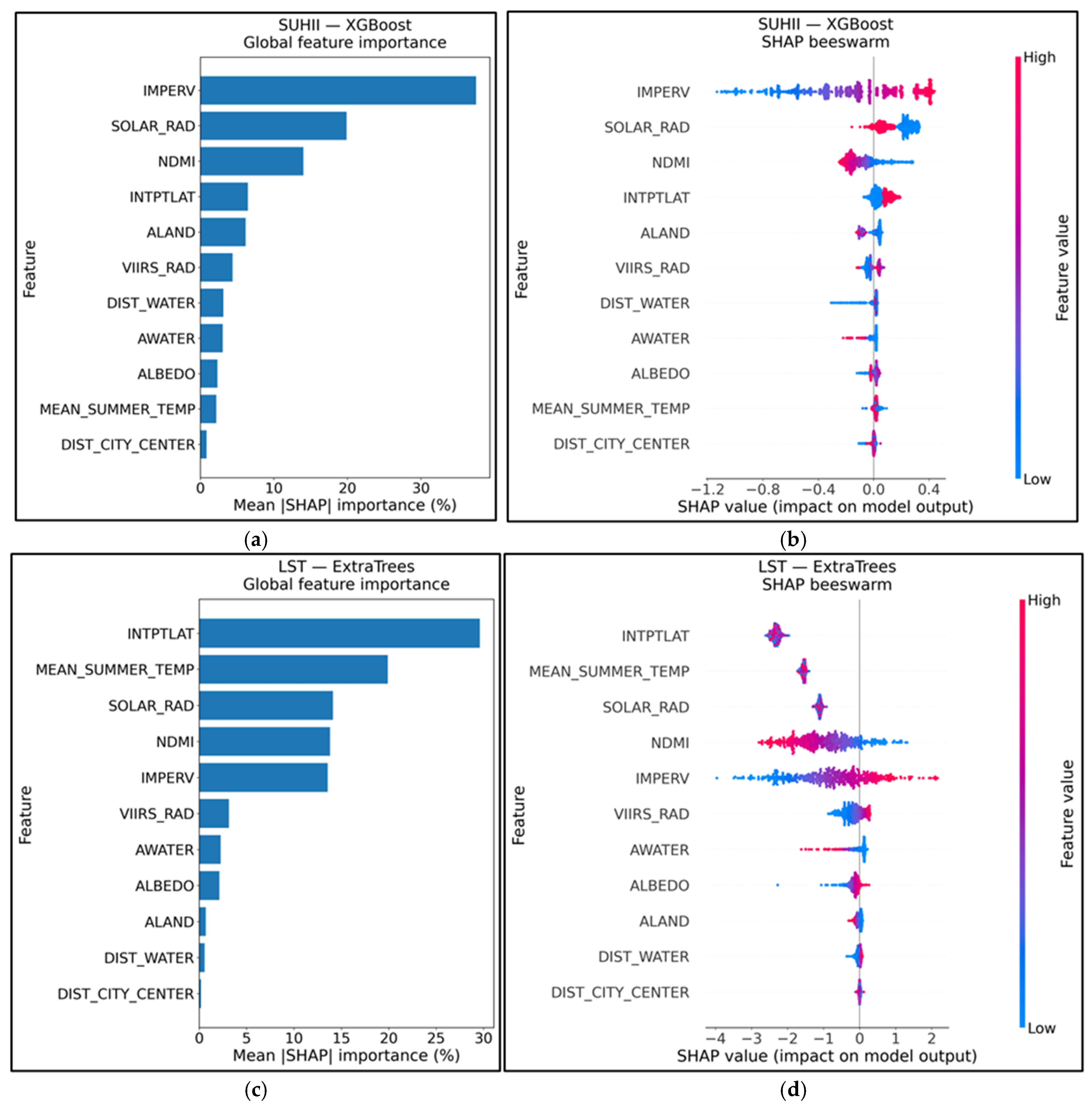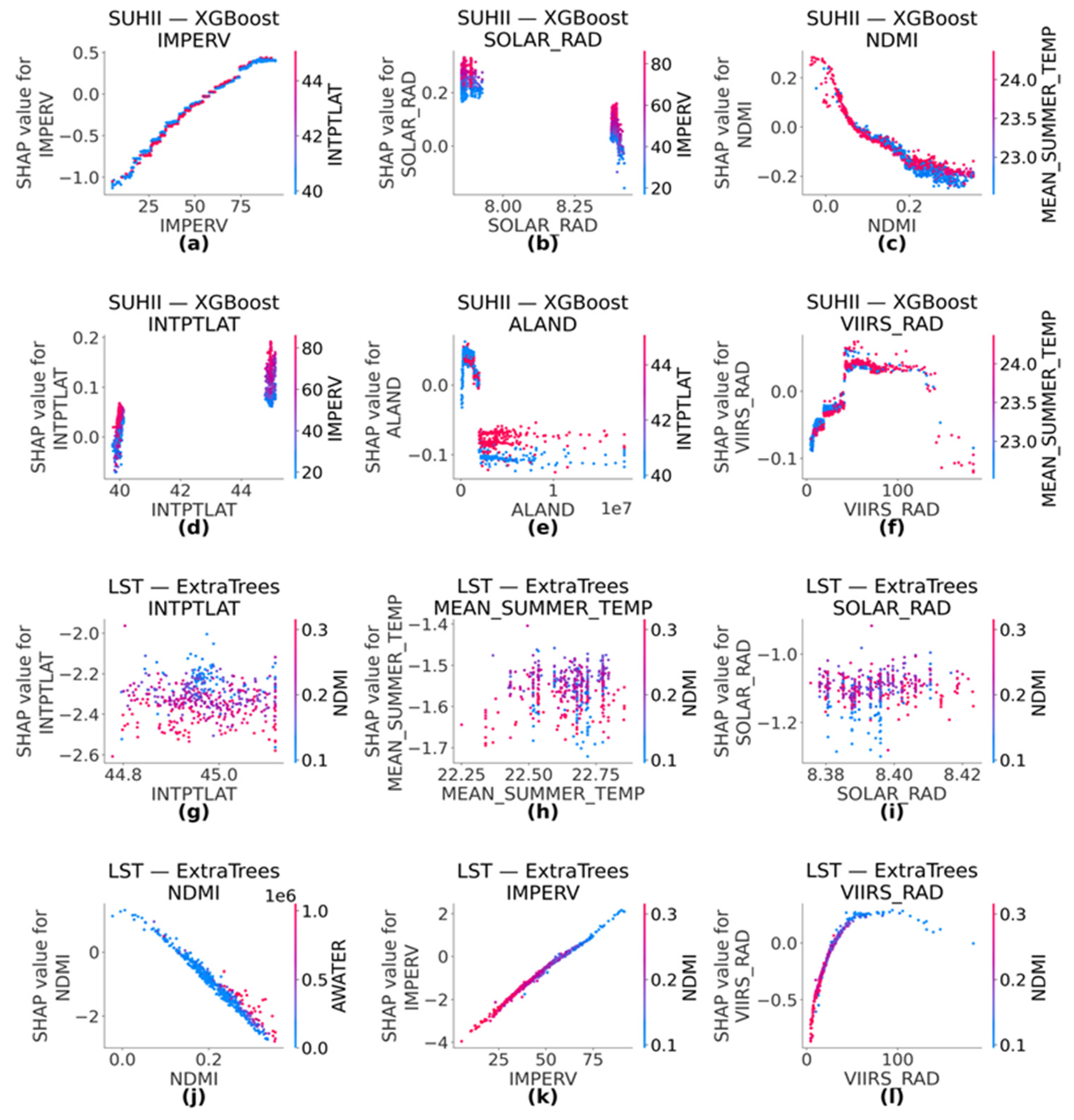 3.5. SHAP-Based Attribution of Tract-Scale Heat Drivers (SUHII vs. LST)