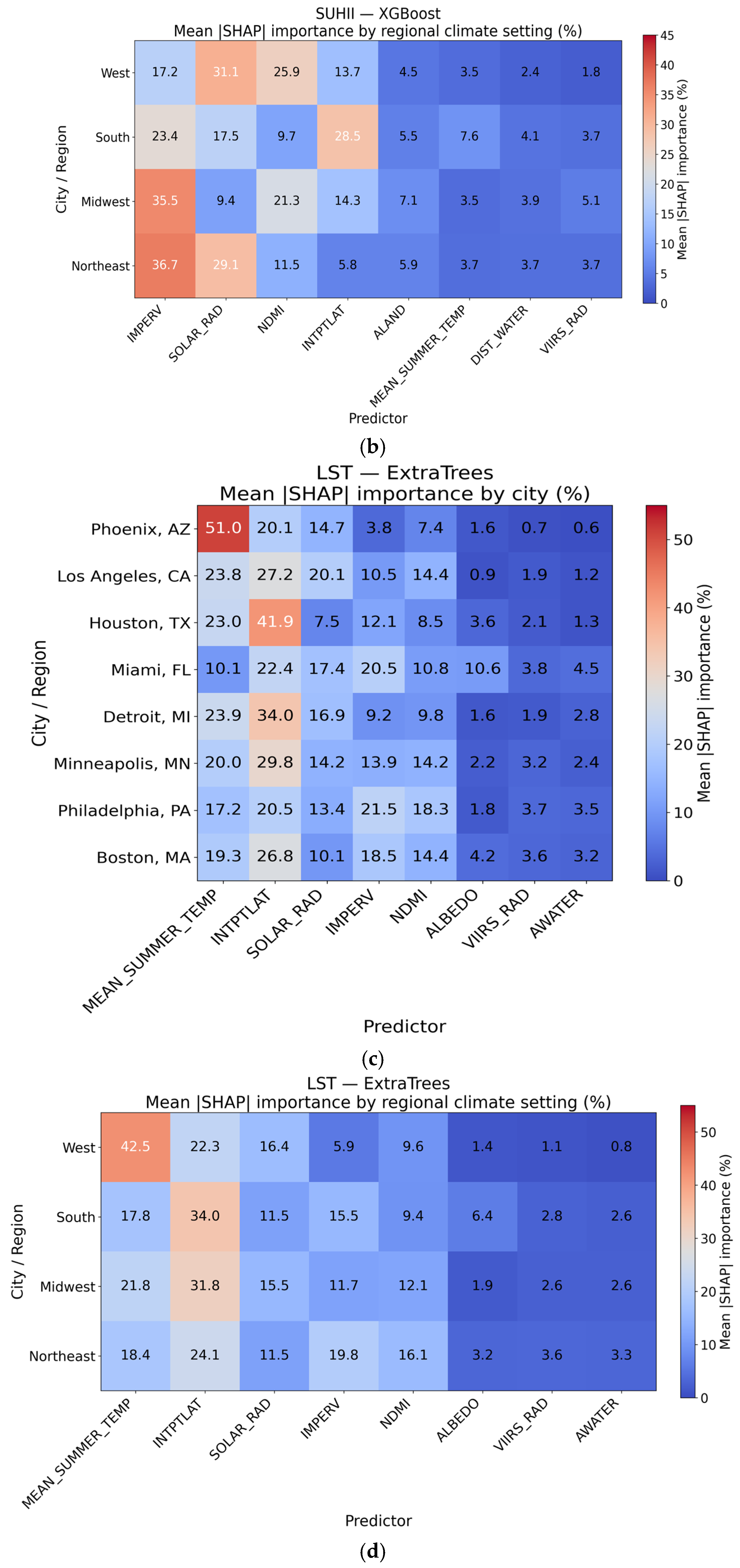 - Drivers of SUHII: Within the fitted models, SUHII is most strongly associated with impervious surface fraction (warmer relative anomalies) and surface moisture availability (cooler relative anomalies), with solar radiation acting as an additional but less spatially differentiating factor.