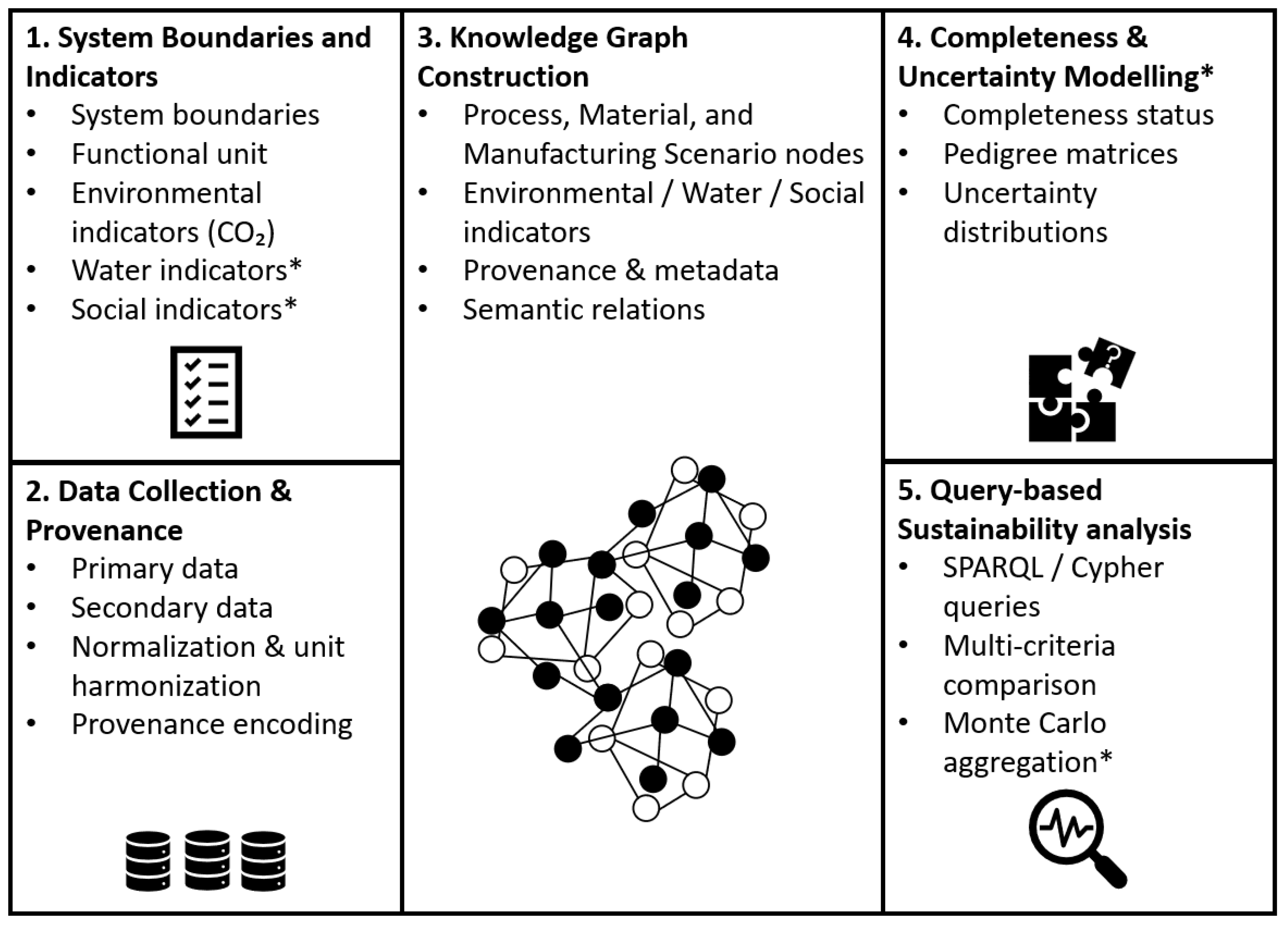 3] toward a comprehensive, uncertainty-aware approach. Our methodology integrates environmental, water-related, and social indicators within a unified KG architecture. It explicitly models uncertainty and completeness at the indicator level. We demonstrate the approach through an Additive Manufacturing case study focusing on selective laser sintering (SLS).