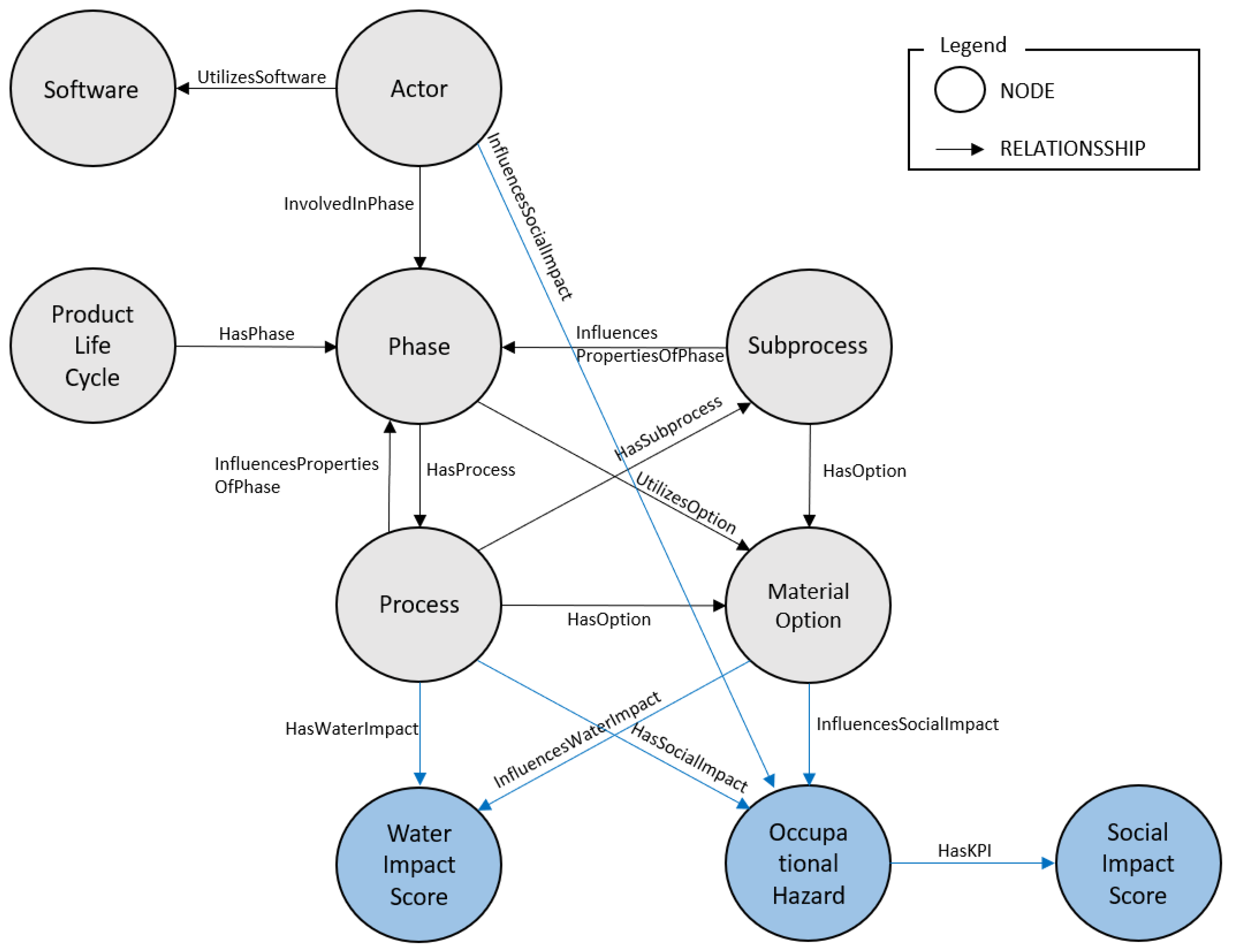 Social sustainability is integrated through dedicated indicators and risk entities, including Social Impact Score and Occupational Hazard nodes. Social indicators are modeled using semi-quantitative scoring approaches derived from UNEP/SETAC S-LCA guidelines and are stored as explicit properties of indicator nodes, together with methodological references, temporal validity, and weighting factors. This structure enables traceable linking from materials and processes to specific social risk factors and aggregated social impact scores.