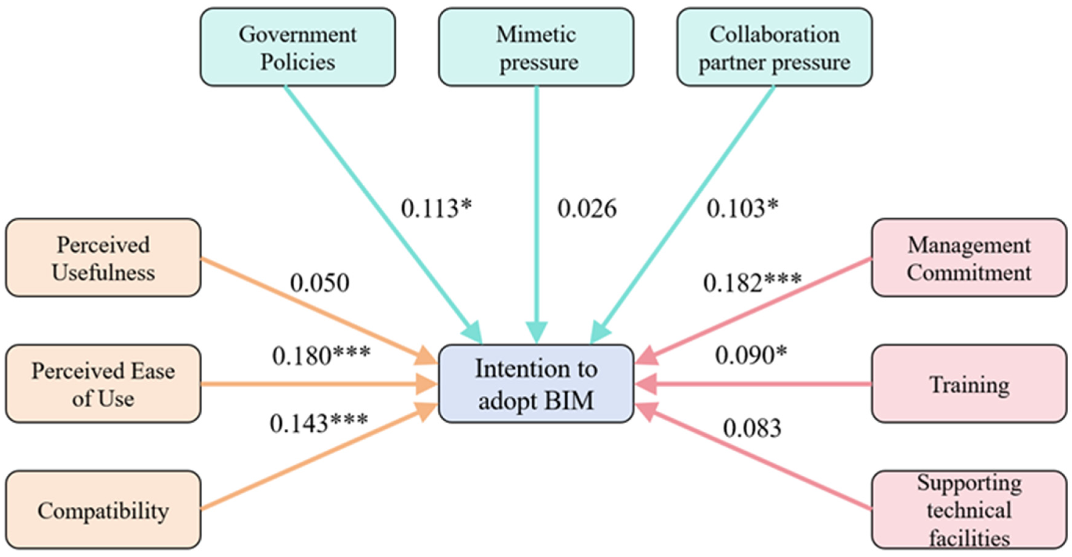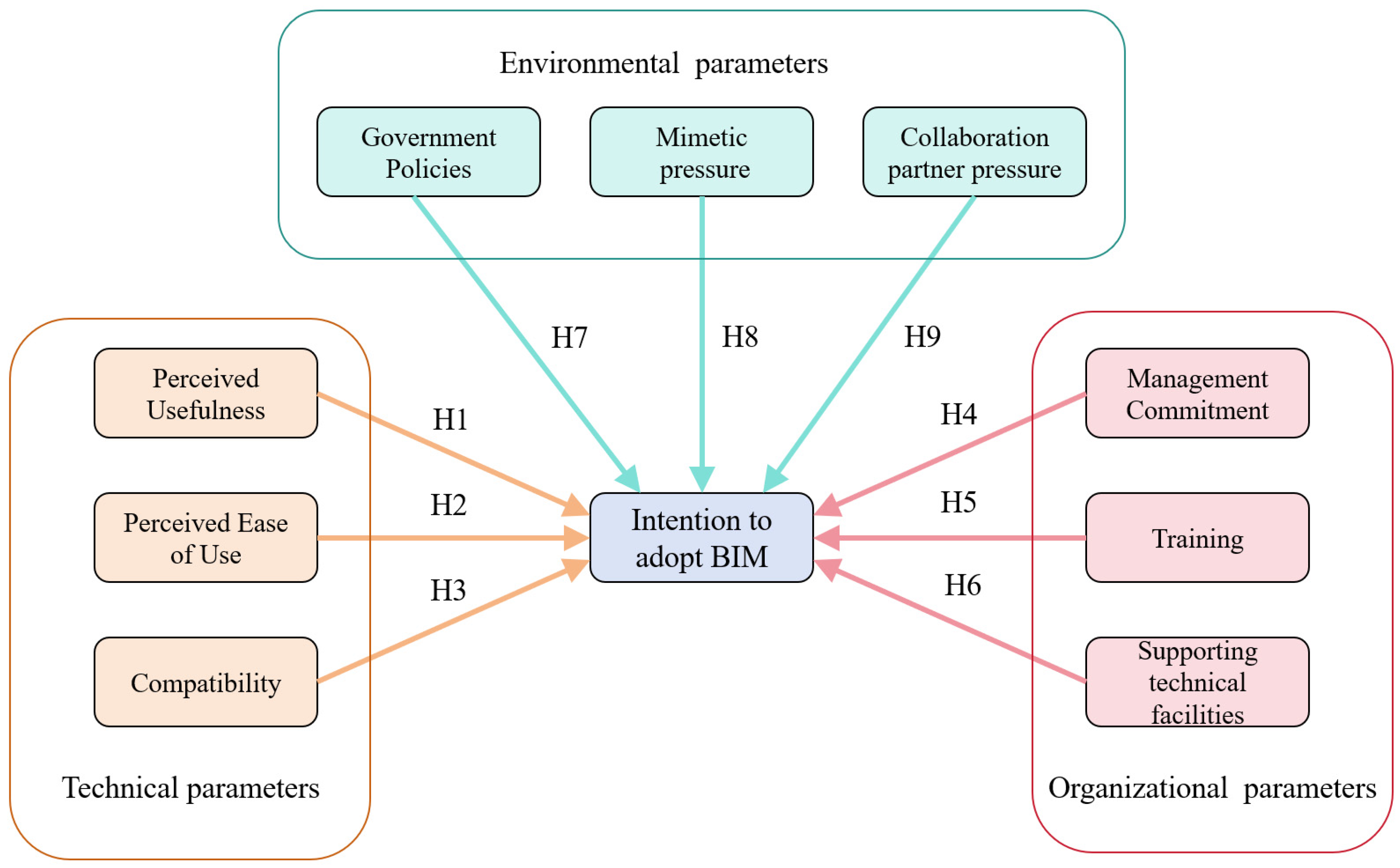 - From the perspective of the environment, mimetic pressure is not a major concern, while collaborators’ opinions play an important role in predicting the intention to adopt BIM technology. Given BIM’s effectiveness in promoting interdisciplinary cooperation, practitioners adopting BIM expect their collaborators to adopt BIM technology to facilitate information sharing. Policies issued by the government are a key driver of new technology diffusion, and it is recommended that the government and industry associations organize BIM technical exchange seminars in addition to conventional policy instruments.