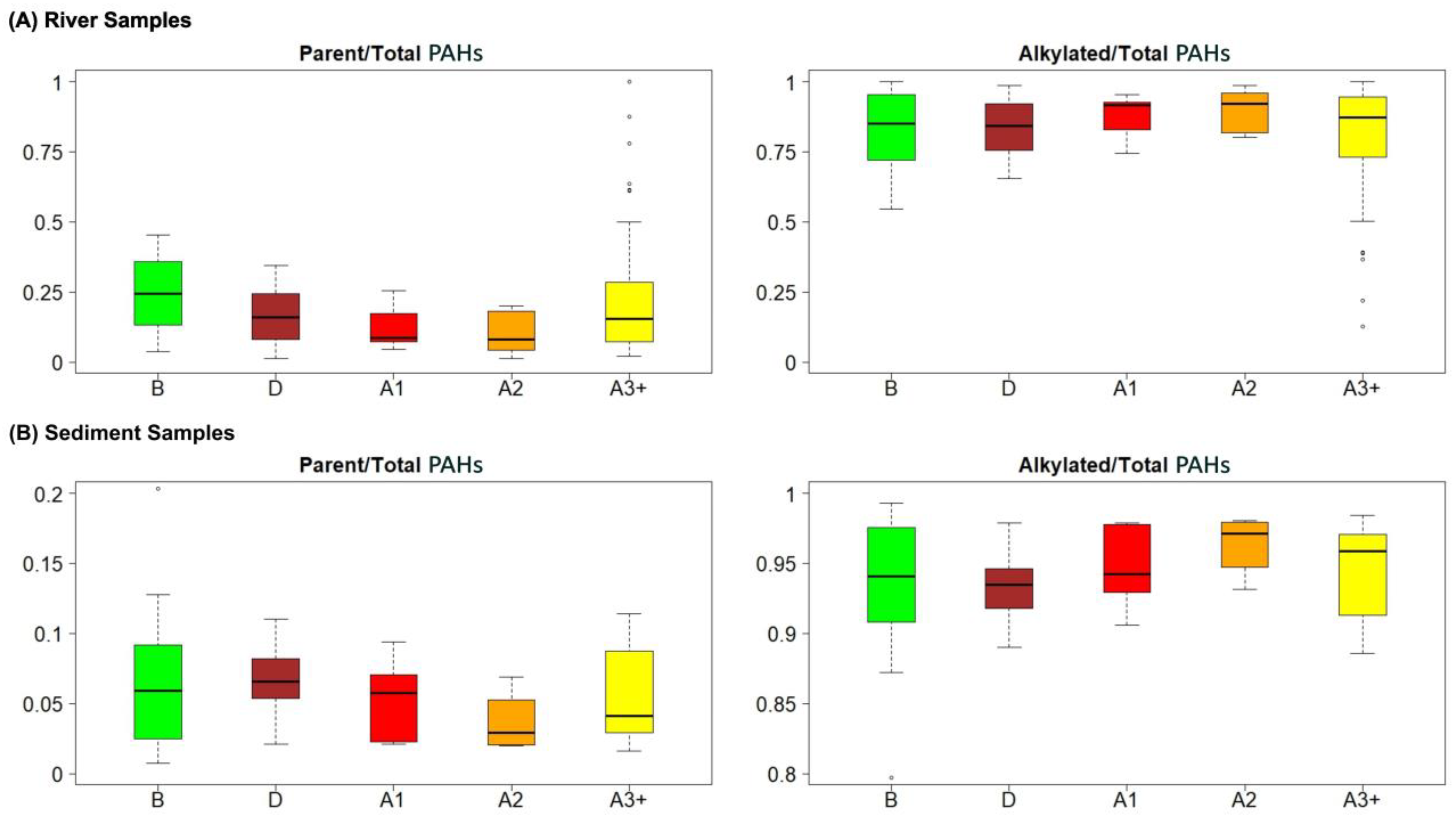 3.5.1. Relative Concentrations of Parent Versus Alkylated PAHs