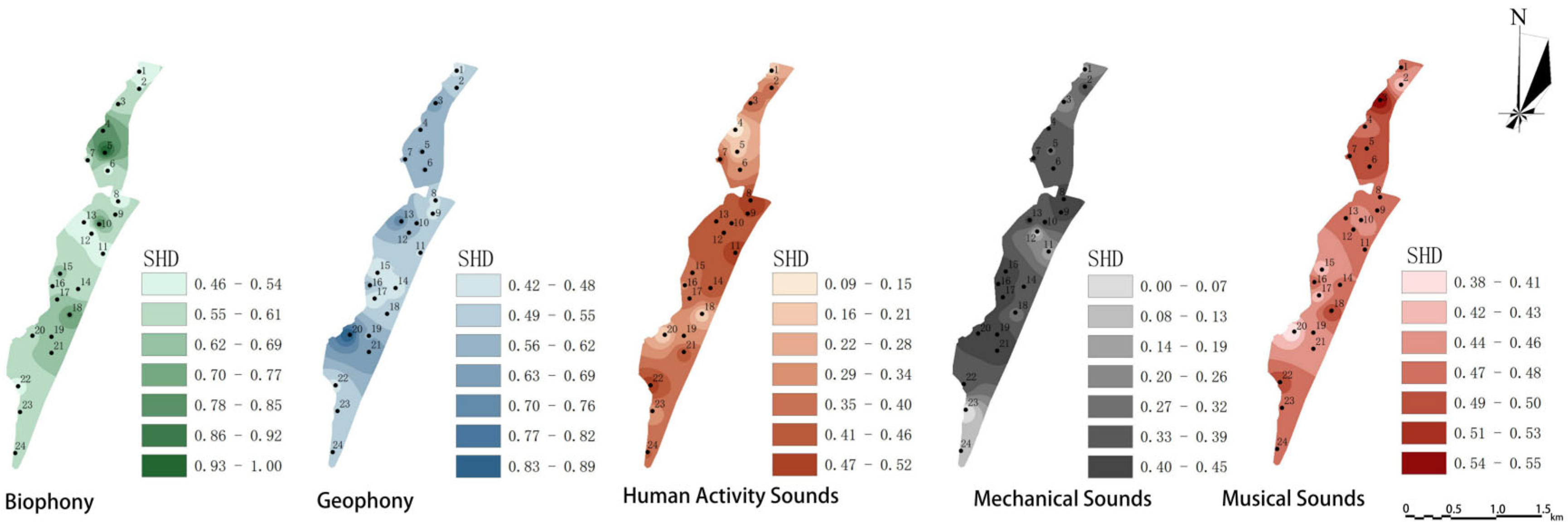 - Chen, Z.; Zhu, T.-Y.; Guo, X.; Liu, J. Landscape Characteristics Influencing the Spatiotemporal Dynamics of Soundscapes in Urban Forests. Forests 2024, 15, 2171. [Google Scholar] [CrossRef]