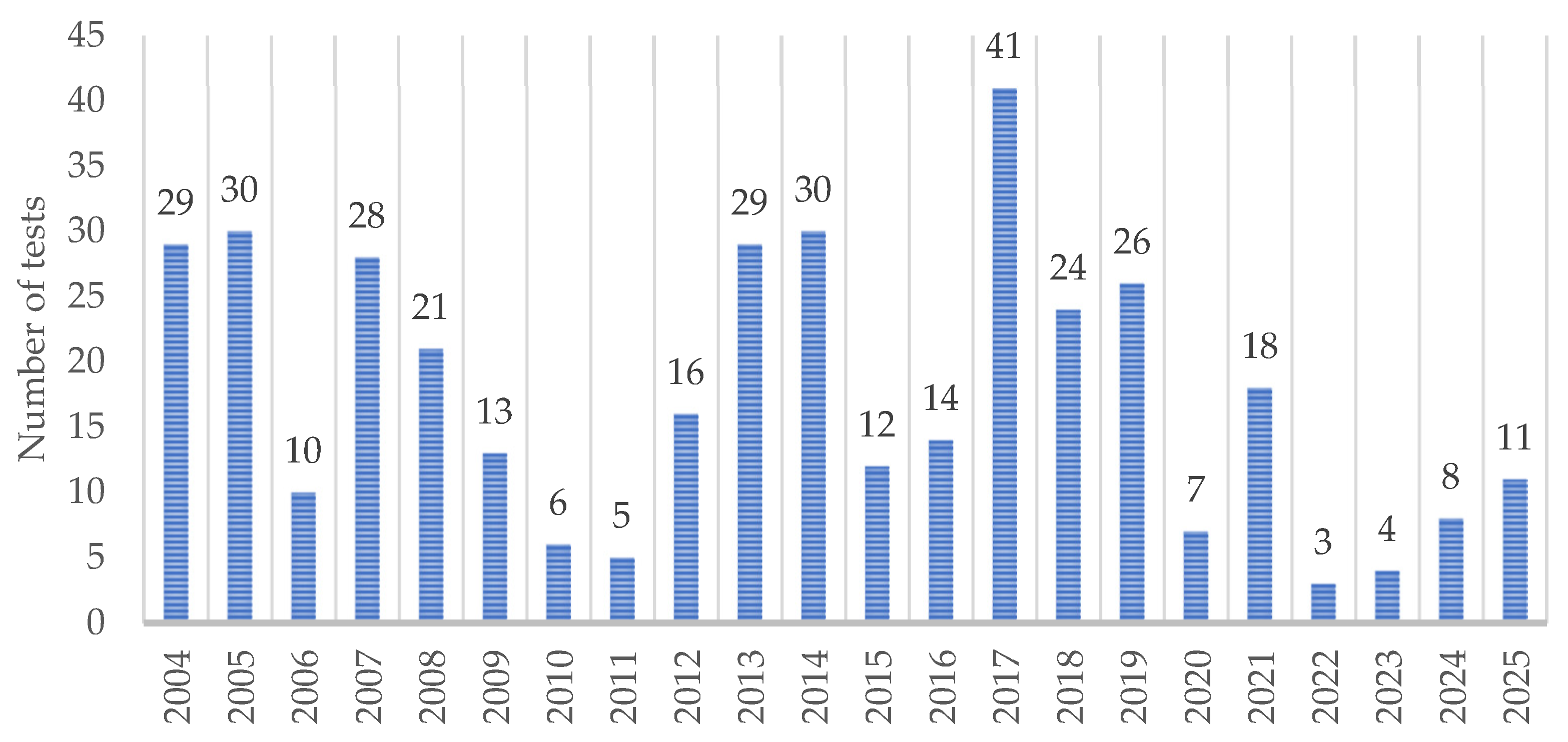 Wet scrub resistance was determined according to the international standard EN ISO 11998. Data presented in the frame of this study were collected from 2004 to 2025. The dataset consists of 385 commercial water-based decorative paints for interior use, with a variety of formulations, such as acrylic, latex, vinyl-based paints and other paints. All samples were tested as received from manufacturers or customers without additional modifications or dilutions. No additional selection criteria for the test paints were used, so the dataset is not a controlled experimental sampling, but represents an unfiltered and practice-based coating market, reflecting the variability of commercially available products over time. This strategy ensured that the dataset reflected real-world conditions and could be used for comparative analysis and sustainability-related assessments.