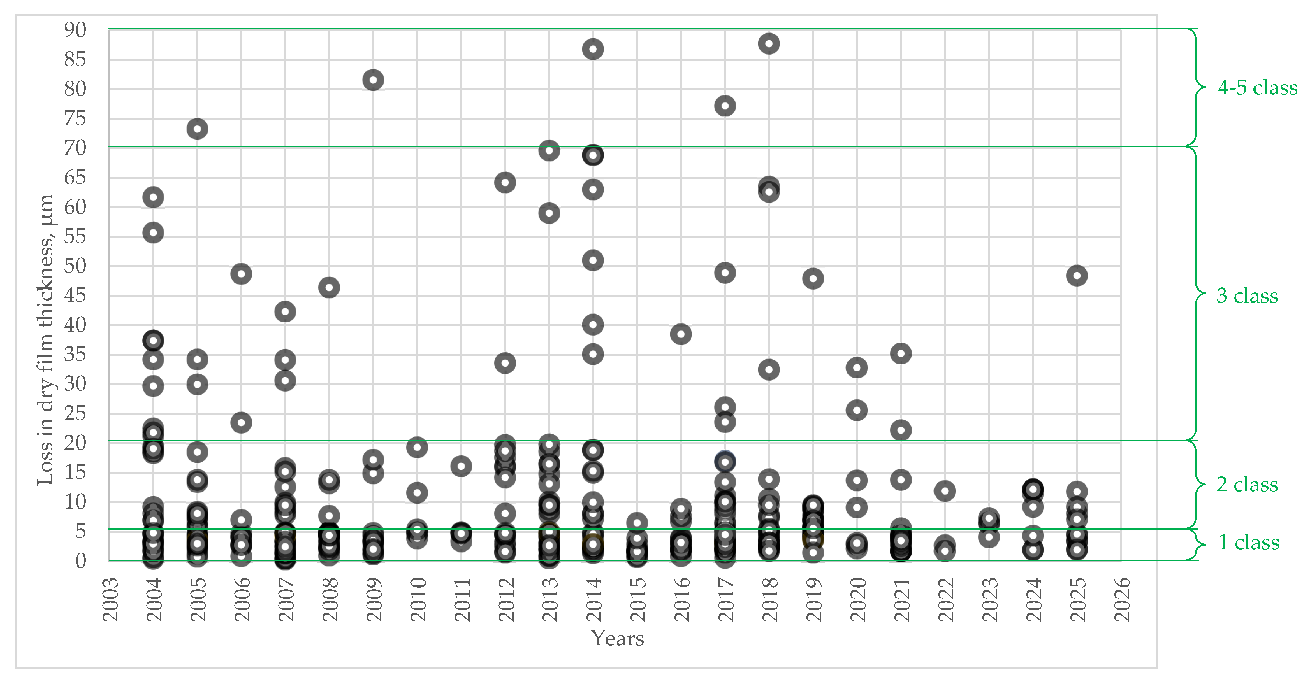 An analysis of data on resistance to wet cleaning (2004–2025) shows that the vast majority of decorative paints (~88–90%) fall into classes 1–2, with class 1 alone accounting for 56.8% of samples. This indicates that the market consistently favors long-lasting coatings resistant to frequent cleaning—this is the primary performance requirement for interior and architectural applications. Long-term trends show that class 1 has remained dominant for two decades, often exceeding 50%. Periodic declines in class 1 prevalence, such as those observed from 2019 to 2024, are largely offset by an increase in class 2 rather than by growth in lower-quality products, underscoring consistently high baseline performance. Class 3 paints account for ~10% of samples and occur irregularly. Classes 4–5 constitute a minimal share (~1.6%) and are essentially absent for many years, indicating that low-quality formulations have largely been eliminated from the modern market. The results provide quantitative evidence of a long-term shift toward coatings with better functional properties. The presented dataset provides a valuable foundation for artificial intelligence (AI) and data-driven materials science, as standardized durability data can be used to develop predictive models linking coating performance, service life, and sustainability indicators.