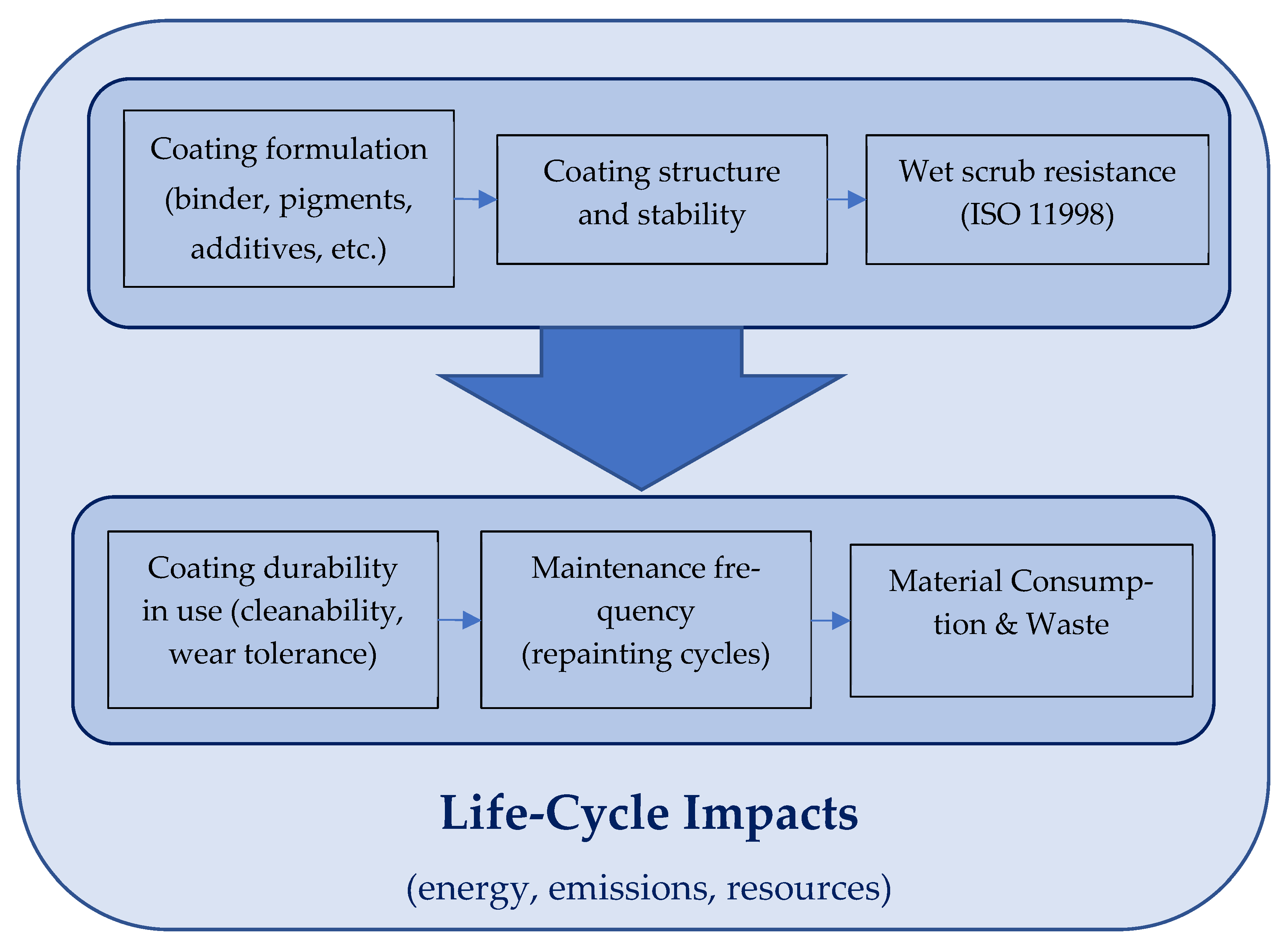 This study is based on the assumption that wet scrub resistance functions as a bridge performance indicator connecting coating formulation, durability, and sustainability outcomes in the built environment. The conceptual framework (