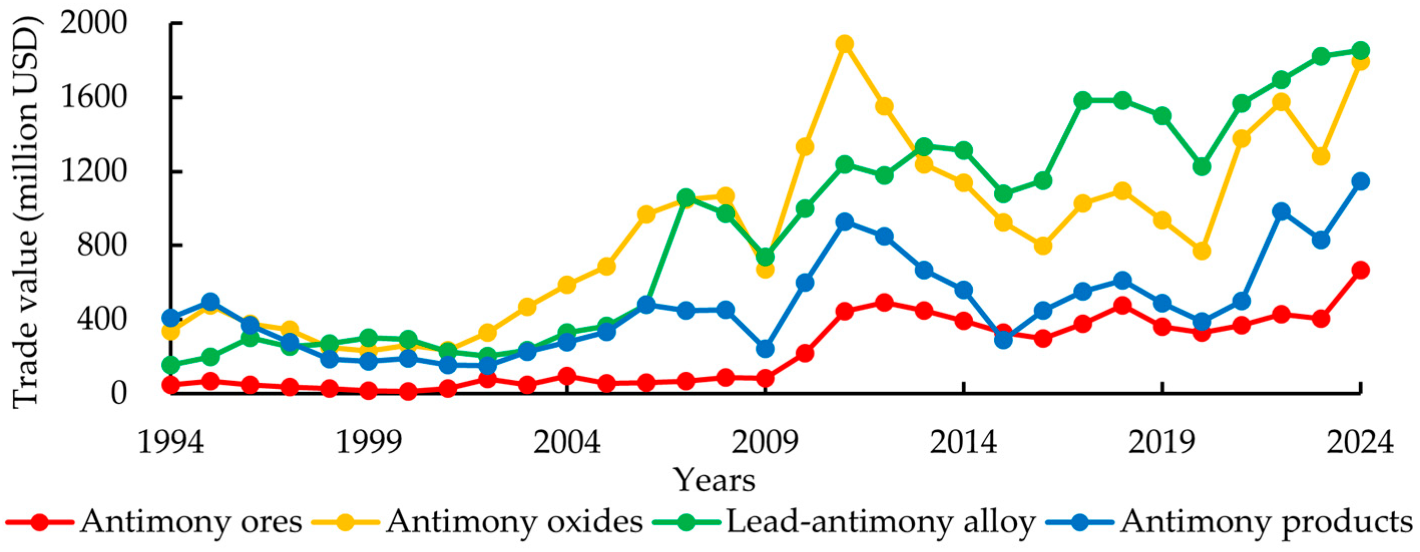 In terms of trade value, antimony ores, antimony oxides, lead–antimony alloys, and antimony products overall exhibited similar fluctuation patterns (see