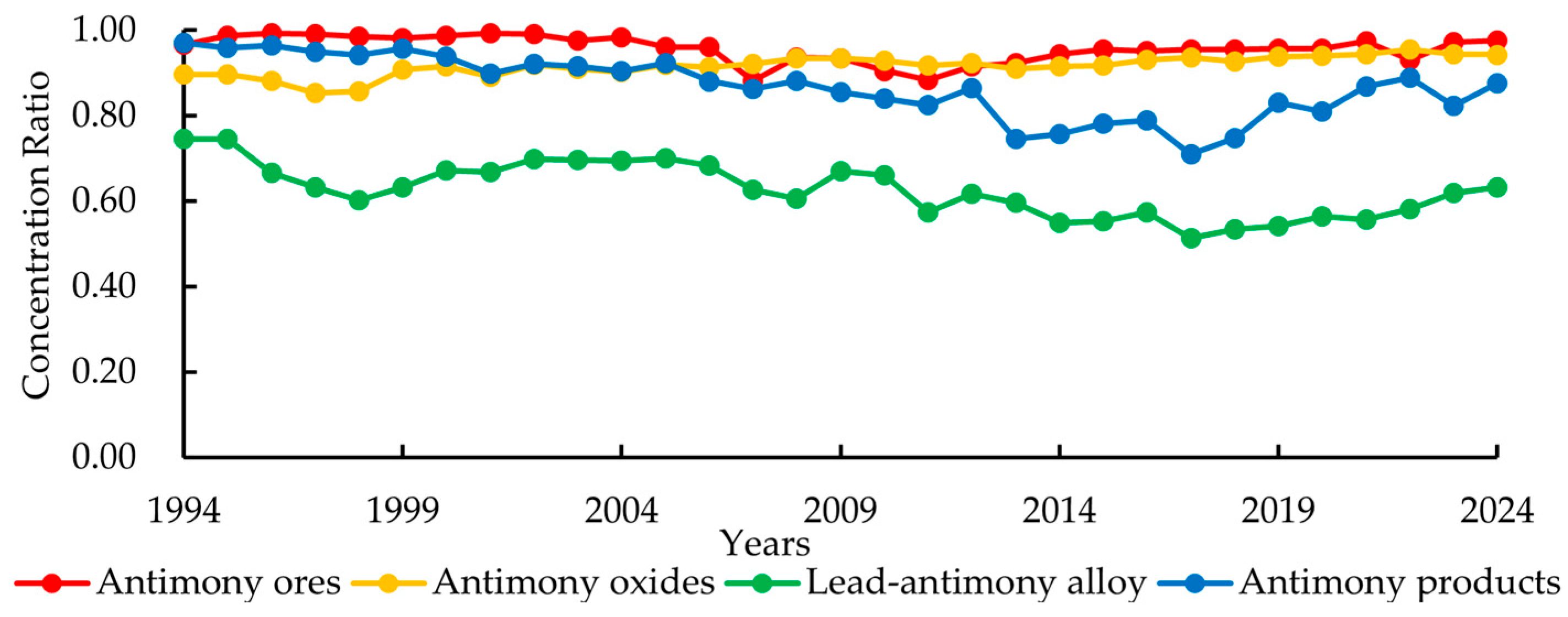 Figure 2). Antimony ores, a typical upstream product in the industrial chain, exhibited characteristics of a highly oligopolistic market. Antimony oxides and lead–antimony alloys are typical midstream products. Among these, antimony oxides showed features of a highly oligopolistic market, while lead–antimony alloys exhibited characteristics of a low-concentration oligopolistic market. Antimony products are typical downstream products. During the period 2010–2018, antimony products showed a tendency to shift from a highly oligopolistic market towards a low-concentration oligopolistic market. However, after 2018, the industrial concentration of antimony products increased again, becoming a highly oligopolistic market. This indicates that for all four typical products, a small number of countries control a very large share of the trade volume. Moreover, this concentration phenomenon is more pronounced in the trade relationships of the three products: antimony ores, antimony oxides, and antimony products.