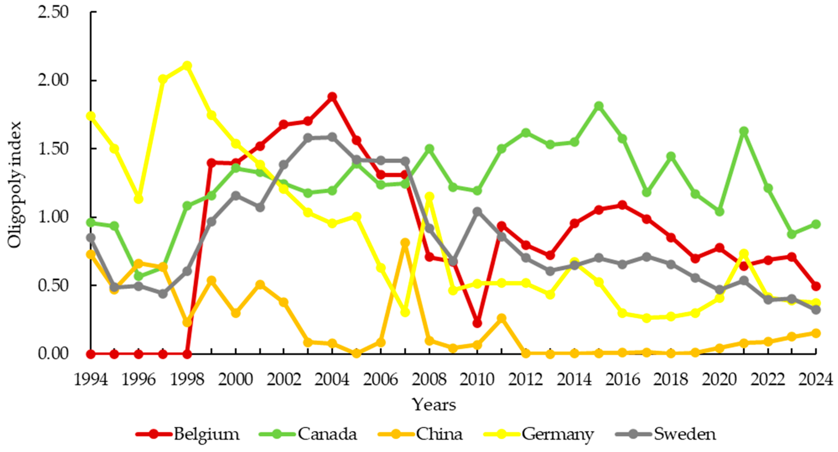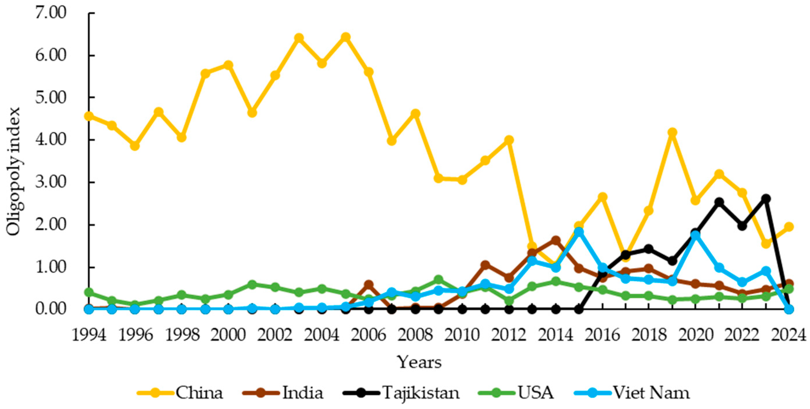 In Formula (1): represents the Industrial Concentration Ratio for product in year ; denotes the rank; is the export volume of country ranked for product in year ; and is the total number of trading countries for product in year . A ≥ 0.7 indicates a highly oligopolistic market. A between 0.4 and 0.7 indicates a low-concentration oligopolistic market. A < 0.4 indicates a competitive market. These thresholds, originally proposed by Bain and adopted by Japan’s Ministry of International Trade and Industry, are widely used in industrial economics. While they were not specifically calibrated for mineral markets, they provide a consistent benchmark for comparing concentration levels across industries and over time. For each year and product , we ranked all exporting countries by total export value (in USD) and selected the top 8 as the C8 oligopoly members for that year. This selection is updated annually, meaning that the composition of the C8 may change over time as countries enter or exit the top ranks. This dynamic approach captures shifts in market leadership and ensures that the oligopoly analysis reflects the most current market structure each year.