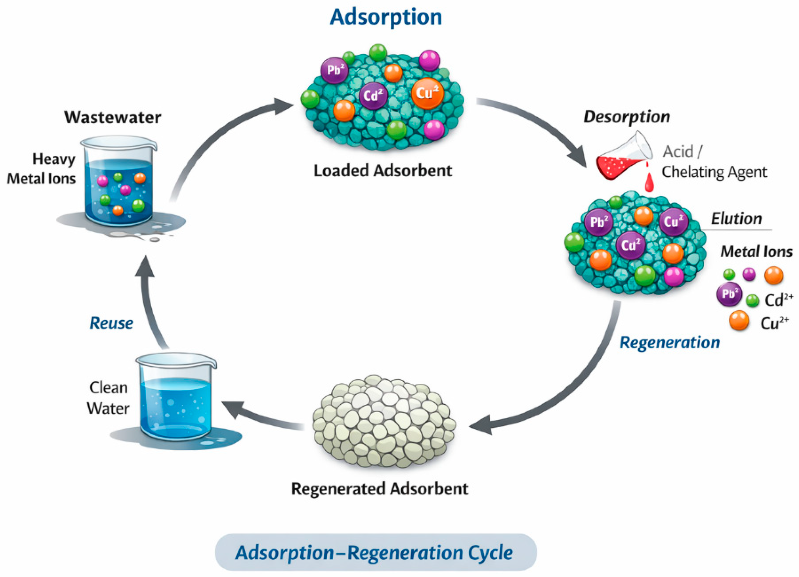 | Hydrated ferric oxide nanoparticle | Cu(II), Cd(II), Pb(II) | Na2EDTA | 5 | >90% | Stable regeneration under chelation-based desorption | [127] |
