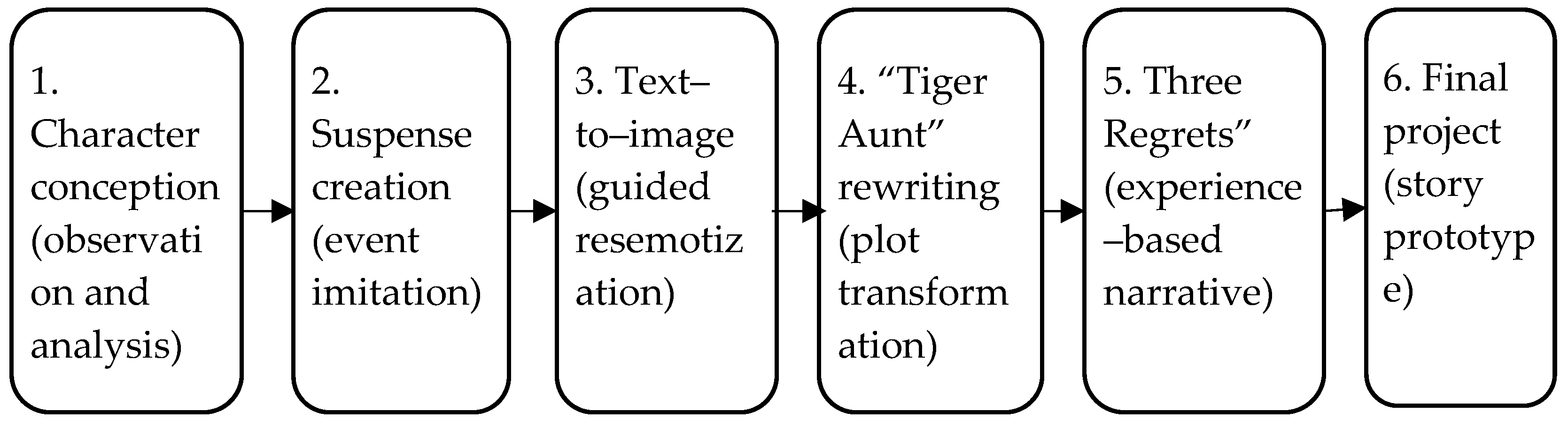 | Ideate | Generating diverse narrative possibilities. | Divergent Tool: Generating character/setting prototypes (Resemiotization) [29]. | Expanding creative breadth and visual imagination. |