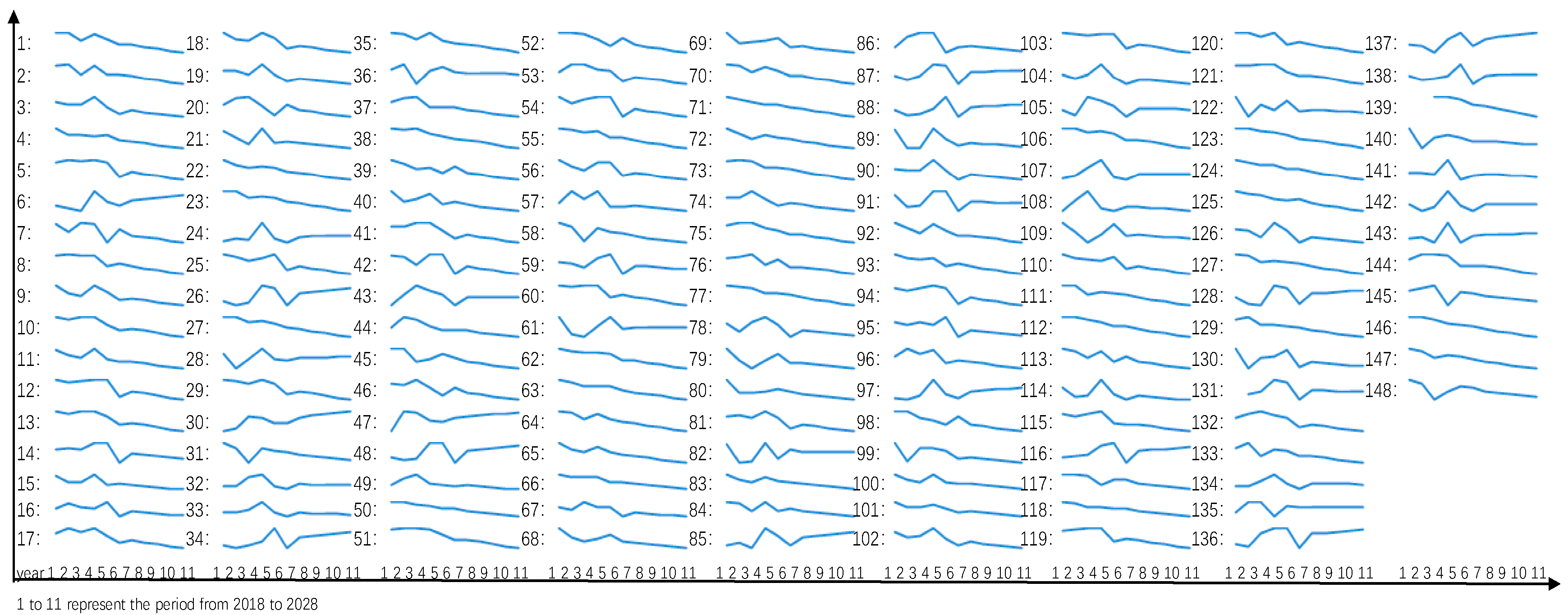 Figure 5, when ESG cost reductions reached 15%, companies in Zone 2 achieved an average performance increase of 194.6%—far exceeding other strategies—yet their ESG performance declined by 8.2%. This short-sighted strategy resulted in 24.5% of firms facing the dilemma of high performance coupled with low ESG standards. While delivering the most pronounced performance gains, this approach carries substantial costs, potentially exposing companies to long-term regulatory risks or reputational damage. When ESG cost reductions narrowed to 12%, Zone 2 enterprises accounted for 18% of the sample, achieving an average performance increase of 174.7%. However, this outcome was marginally less effective than the 15% reduction strategy, with an average decline in ESG performance of 6.9%. Although this strategy substantially enhances corporate performance, it struggles to stem the decline in ESG performance. Consequently, it is not recommended and represents an irrational choice for enterprises prioritizing sustainable development and social responsibility. When ESG cost reductions were maintained at 10%, companies in both Region 1 and Region 2 achieved an average performance increase exceeding 142.4%, with ESG performance declining below 6.2%, accounting for 19.4% of firms. Although performance growth was substantial, it could not prevent significant ESG performance deterioration. Excessive ESG cost cuts lack sustainability, rendering this strategy unsuitable as a priority option for enterprises. Further reducing ESG cost cuts to 8% enabled Zone 1 enterprises to achieve 137.2% performance growth. This substantial improvement in corporate performance was accompanied by a mere 4.1% decline in ESG performance, demonstrating favorable balance. 14.4% of enterprises successfully established themselves as dual-excellence benchmarks. This approach suits enterprises pursuing high performance while maintaining ESG standards, enabling substantial performance gains without unduly compromising sustainability. In contrast, the 5% ESG cost reduction strategy proves more robust. 11.5% of enterprises concentrated in Zone One achieved an average performance increase of 102.8%—a considerable growth rate—with ESG performance declining by only 2.7%. 88.5% of enterprises fell within Quadrant IV, where corporate performance saw a modest 5.6% increase and ESG performance experienced only a slight 2.8% decline, exhibiting relatively stable overall fluctuations. This strategy suits risk-averse enterprises prioritizing ESG performance and accepting the risk of slower growth, particularly in ESG-sensitive sectors like new energy where its stability proves more appealing.