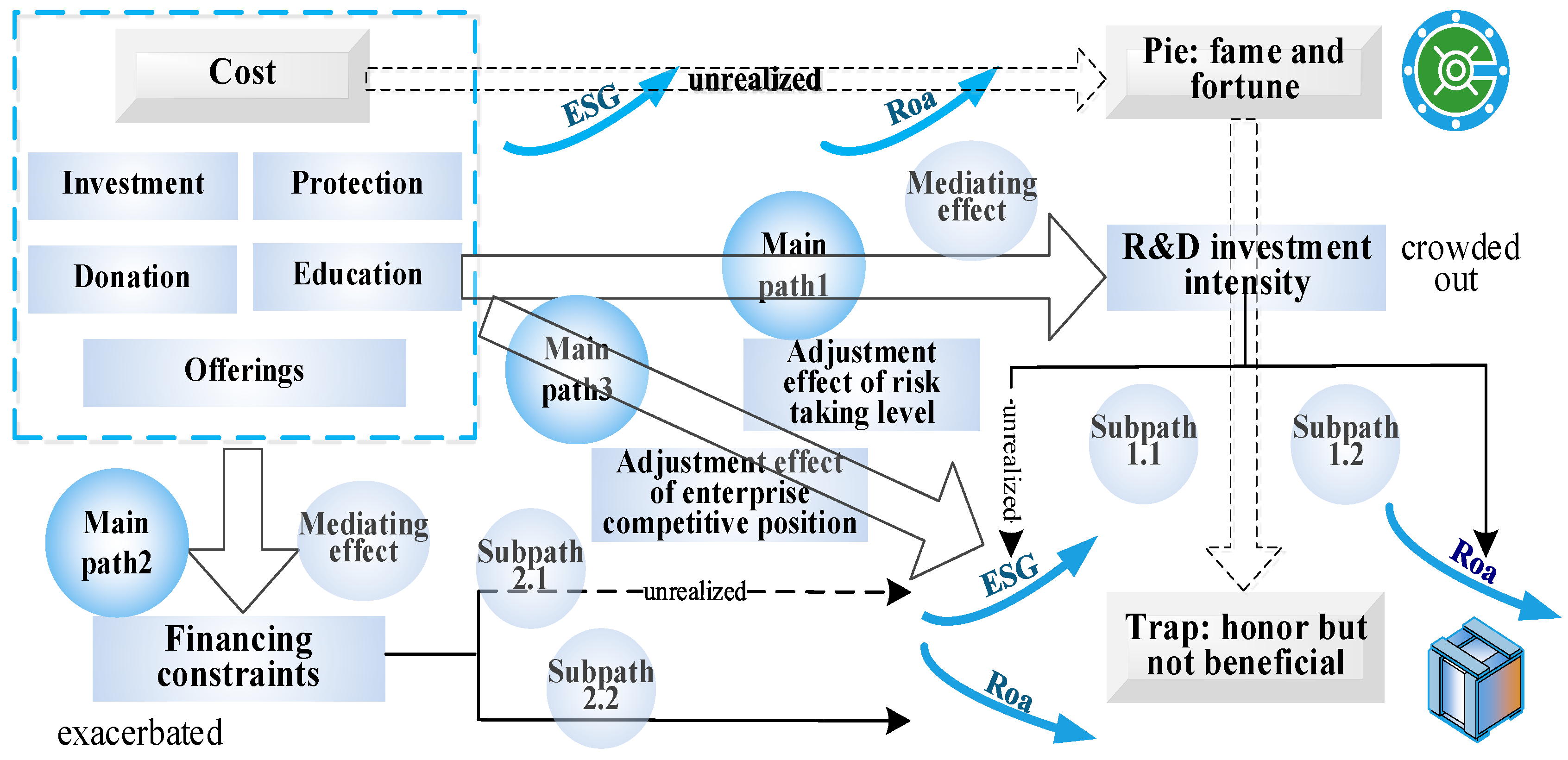 Figure 6 below). (3) Primary pathway 2 for this divergence occurs when heightened ESG costs exacerbate financing constraints, consequently reducing corporate performance. (4) Primary pathway 3: Cost investments targeting ESG ratings significantly enhance ESG performance. (5) Risk-taking levels markedly amplify the negative impact of ESG costs on corporate performance. (6) Competitive position significantly mitigates the negative impact of ESG costs on corporate performance.
