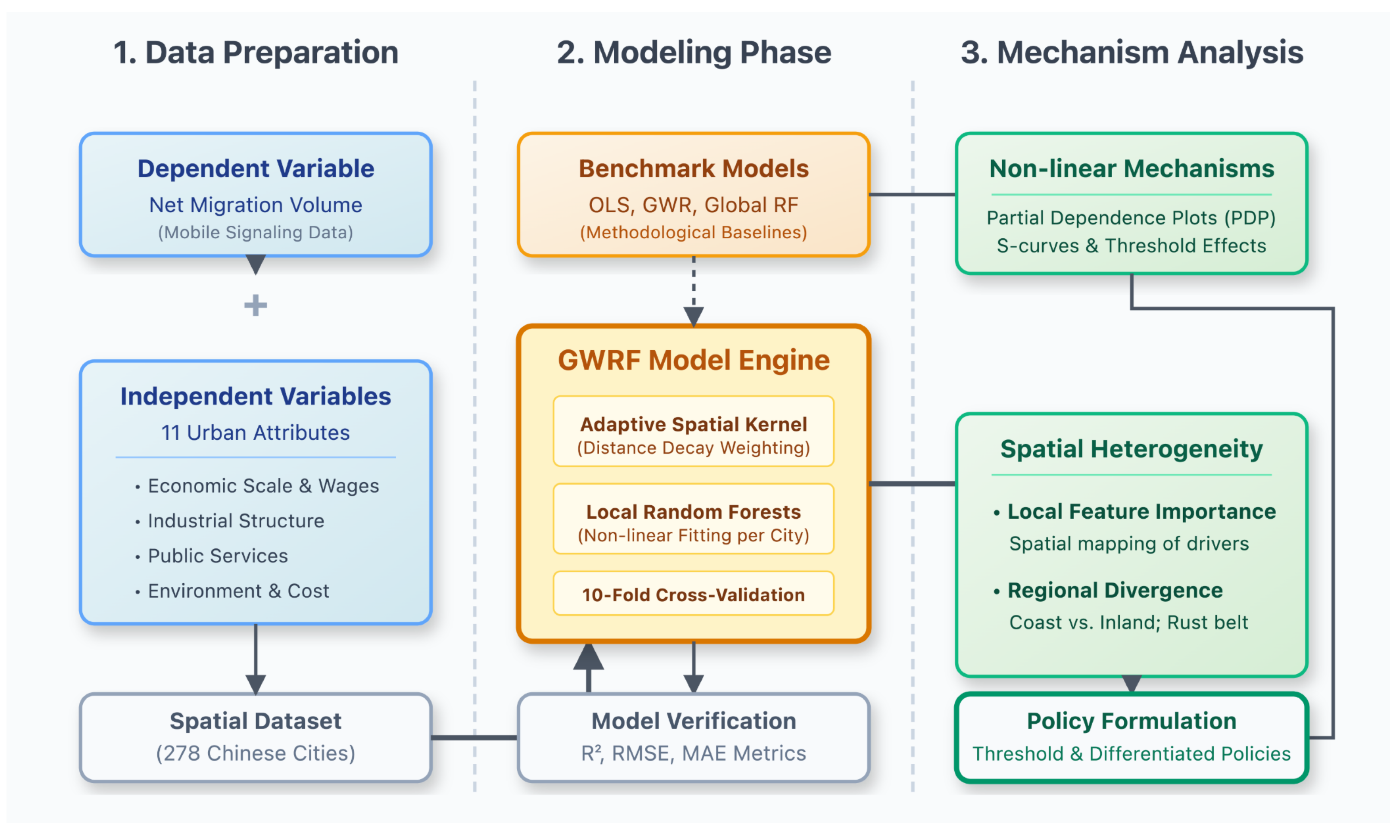 - To examine the spatial non-stationarity of these driving mechanisms and determine whether distinct migration regimes exist across China’s diverse geographical regions;