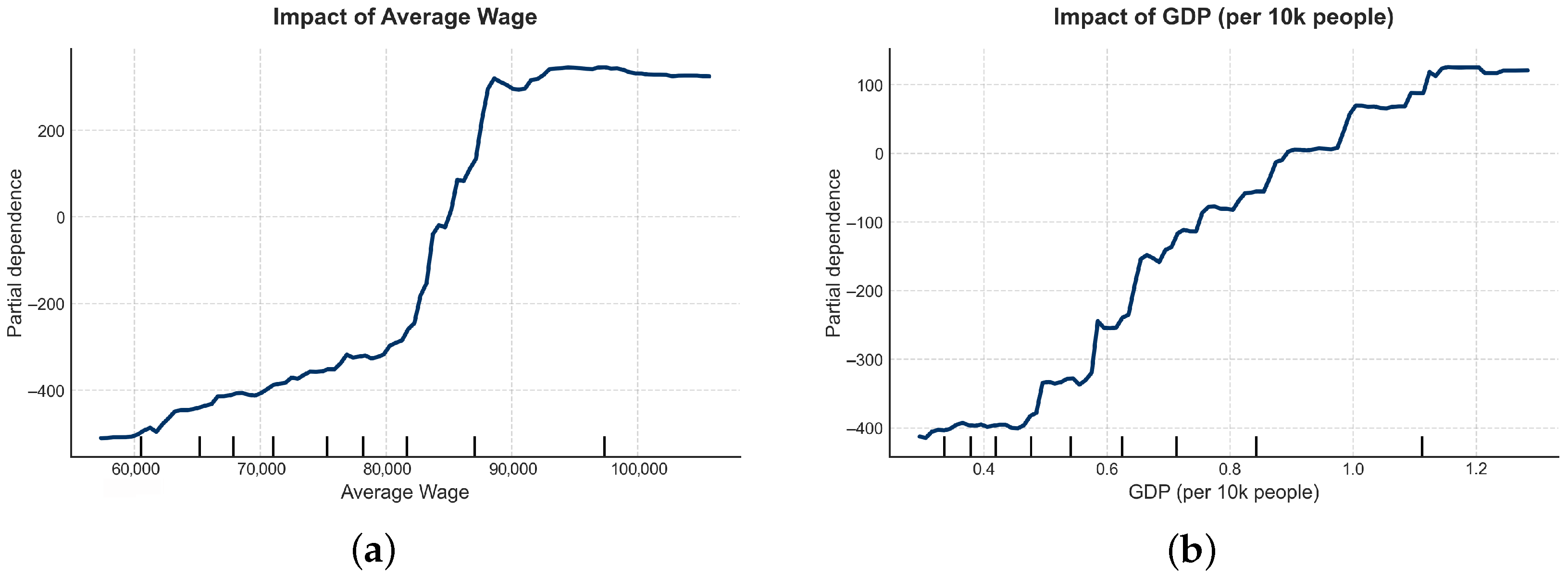 - The “S-shaped” Growth and Saturation of Economic Drivers: The PDP curve for average wage shows a classic “S-shaped” pattern. Below 80,000 RMB, growth is flat (the “low-level equilibrium trap”). Once the 80,000 RMB threshold is breached, the slope rises sharply, showing strong increasing marginal returns. Beyond 90,000 RMB, the curve flattens again, suggesting that for ultra-high-income cities, salary becomes less of a decisive factor compared to other non-economic elements. Figure 5 illustrates the response curves for income-related factors.