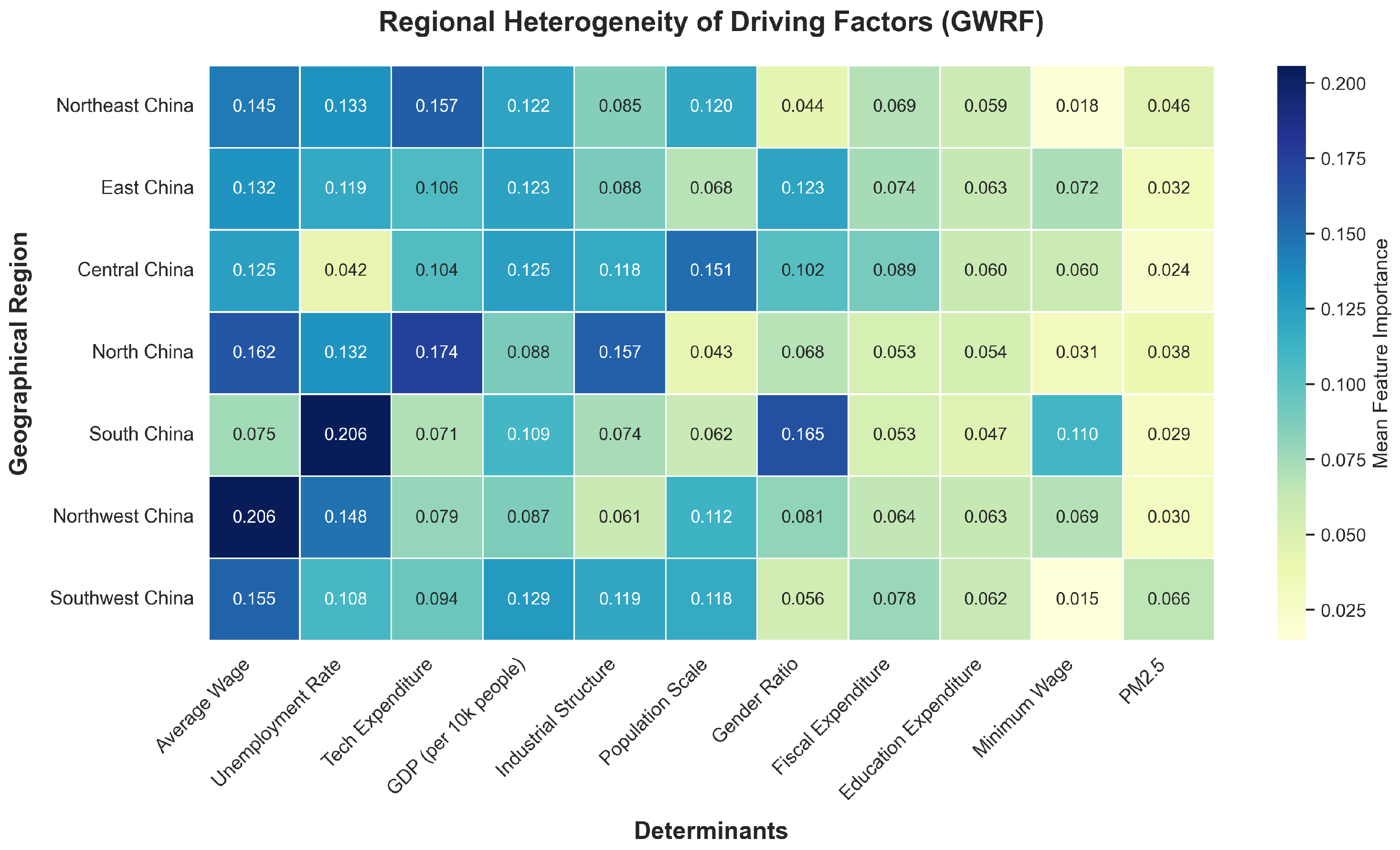- South China: This region is extremely sensitive to the “Unemployment Rate” (, the region’s top factor), even surpassing wages (). Migration here is highly “employment-following,” reacting rapidly to job market fluctuations. The “Gender Ratio” importance () is also the highest in the country.