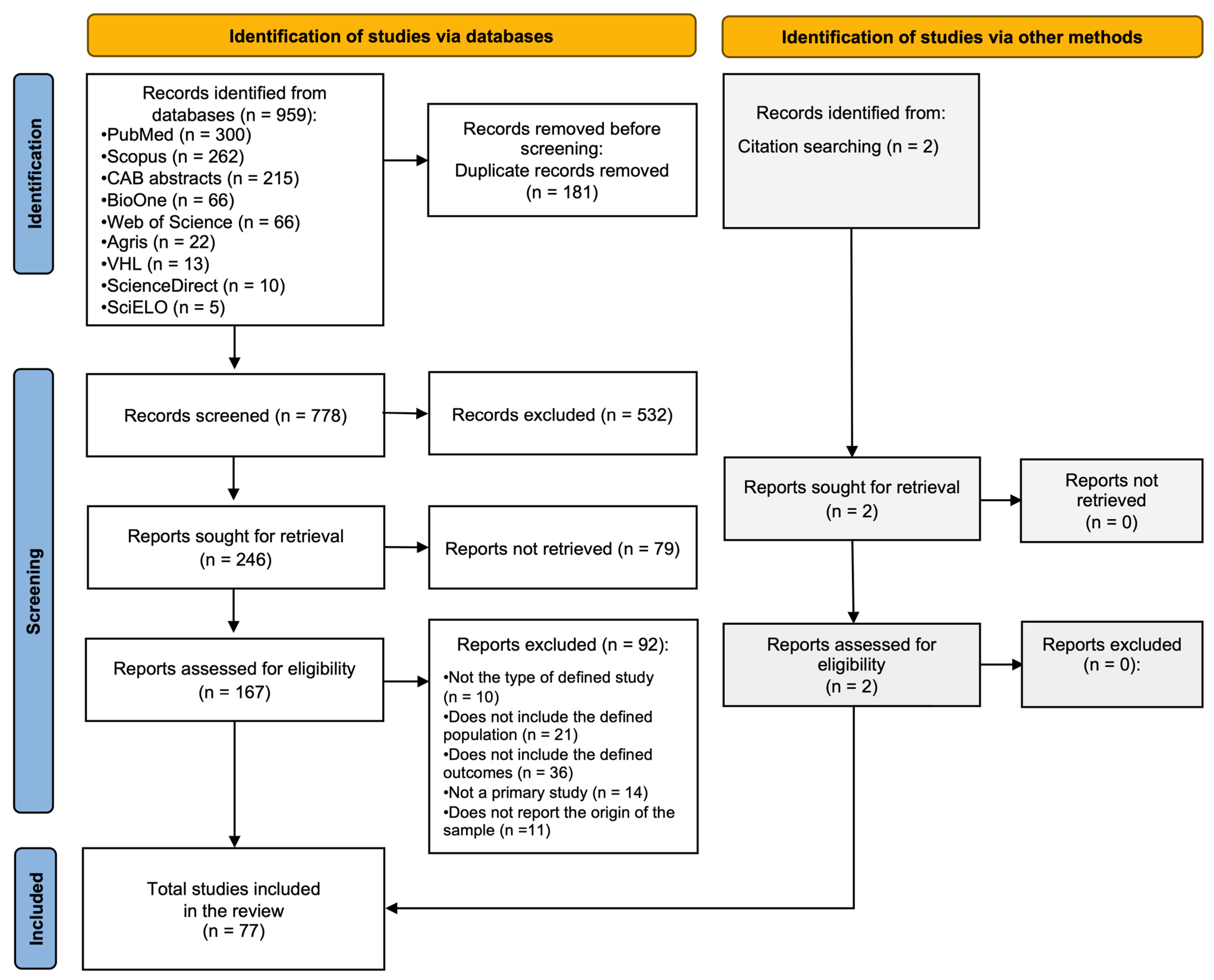 | Studies | We included primary studies with experimental design that reported feeding or contact bioassays under laboratory, greenhouse, or experimental plot conditions. The studies should be published in English, Spanish, or Portuguese as full text in peer-reviewed journals. No temporal or regional restrictions were applied, and unpublished studies (gray literature) were not considered |