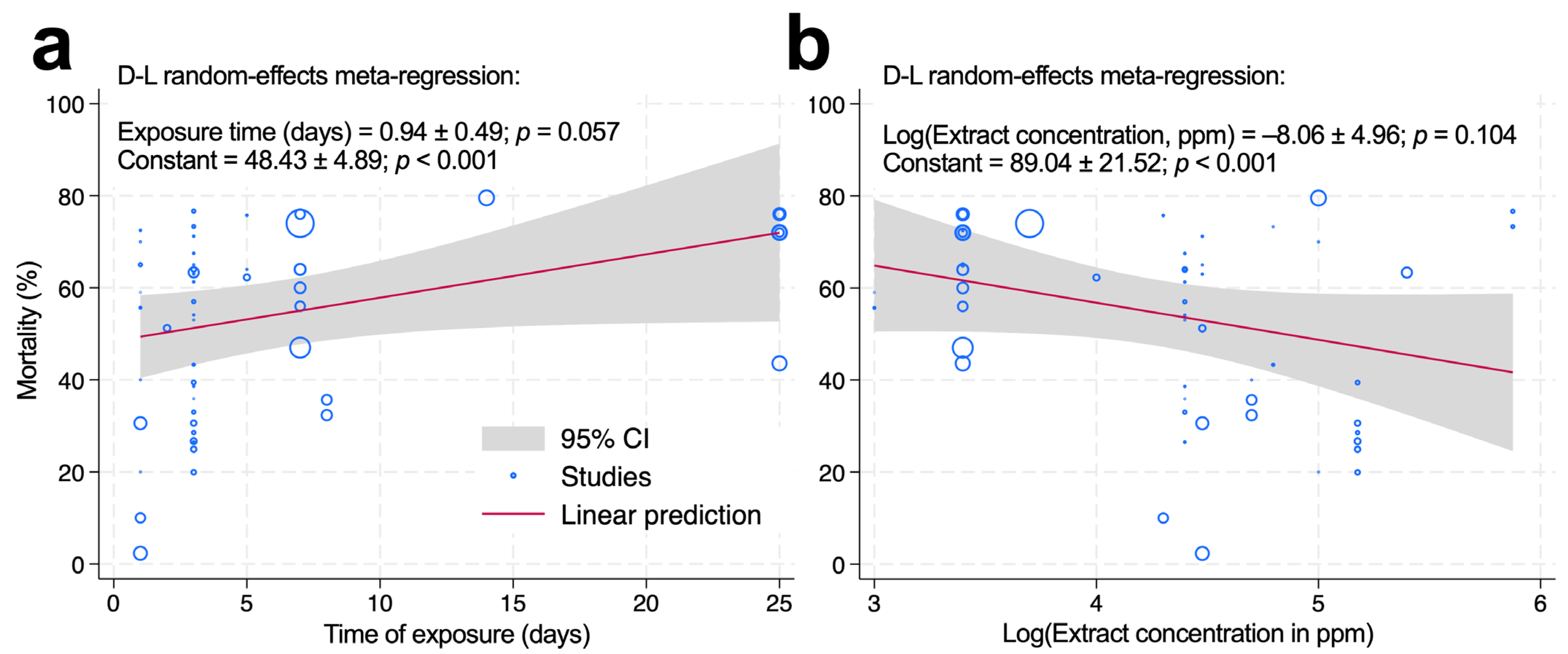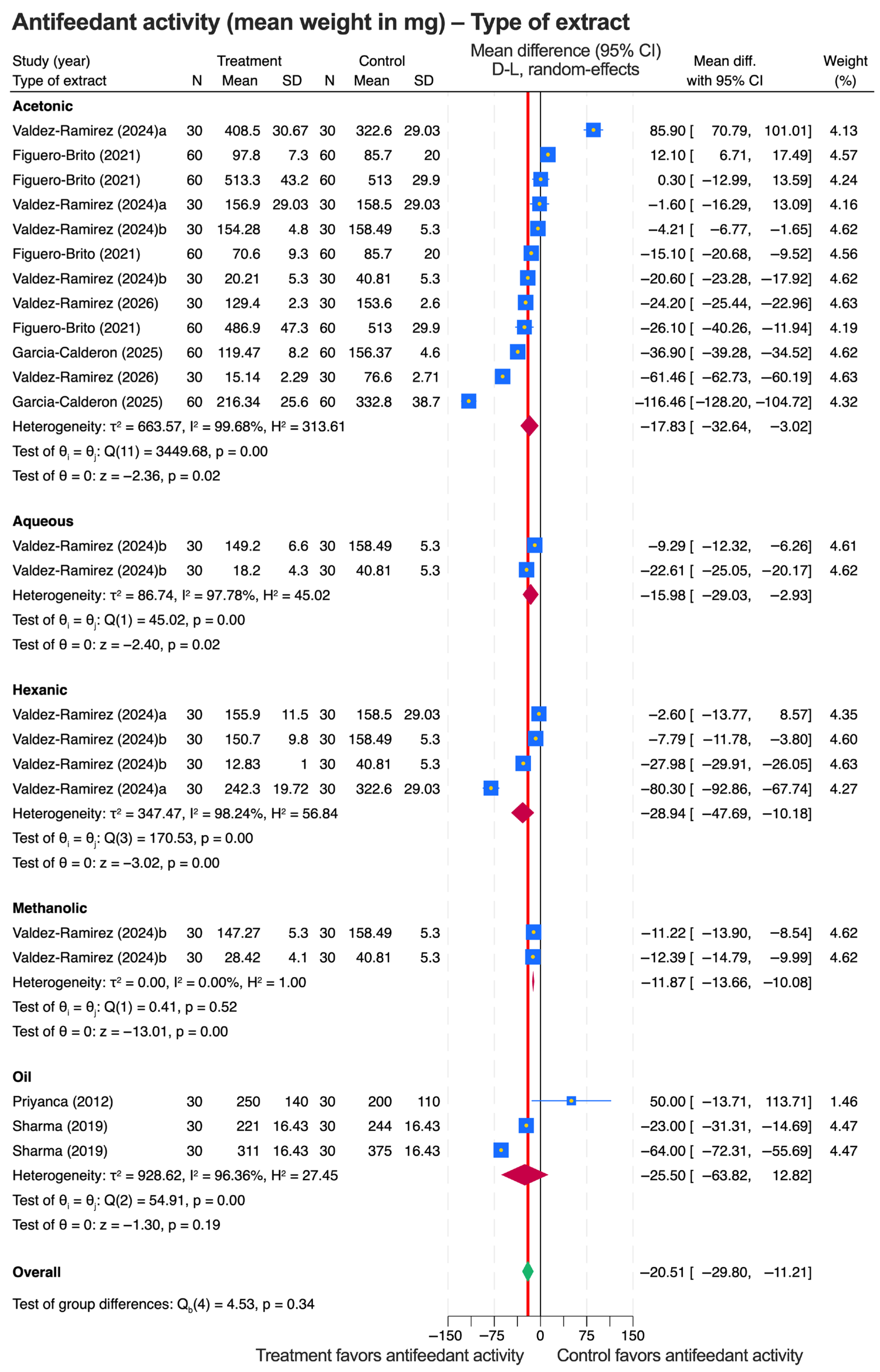 3.8. Meta-Analysis of the Oviposition Inhibition