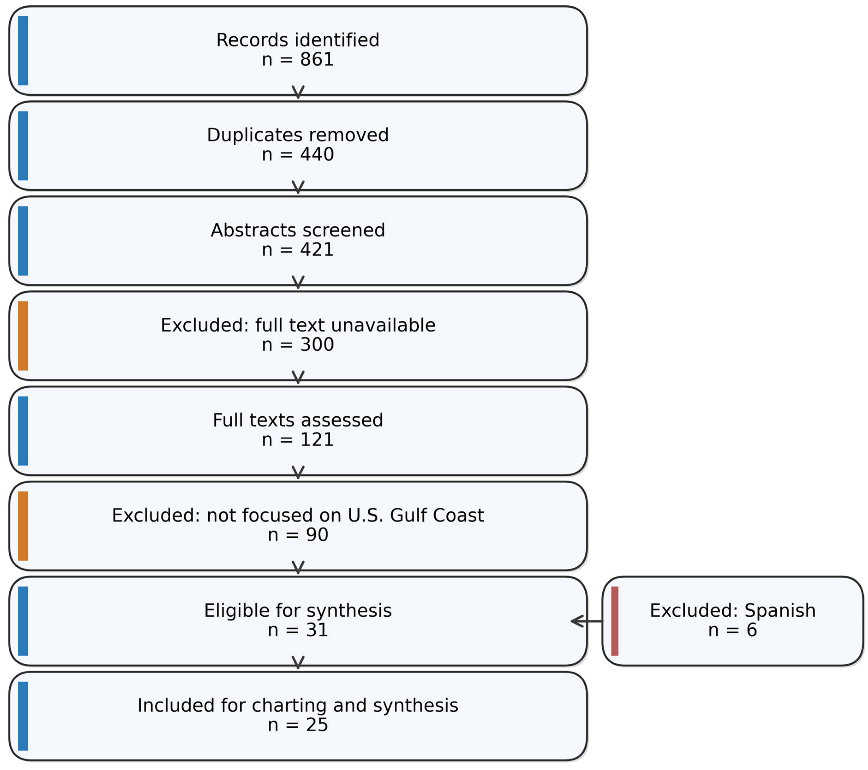 PRISMA-ScR flow (reported in Methods): Records identified from databases and other sources (n = 861). Duplicates removed (n = 440). Abstracts screened (n = 421). Records excluded because full text was unavailable (n = 300). Full-text reports assessed for eligibility (n = 121). Full-text reports excluded because they were not focused on the U.S. Gulf Coast (Louisiana, Texas, Mississippi, Alabama, Florida) (n = 90). Reports eligible for synthesis (n = 31). Full-text reports excluded because they were Spanish-language sources (n = 6). Sources of evidence included for charting and synthesis (n = 25).