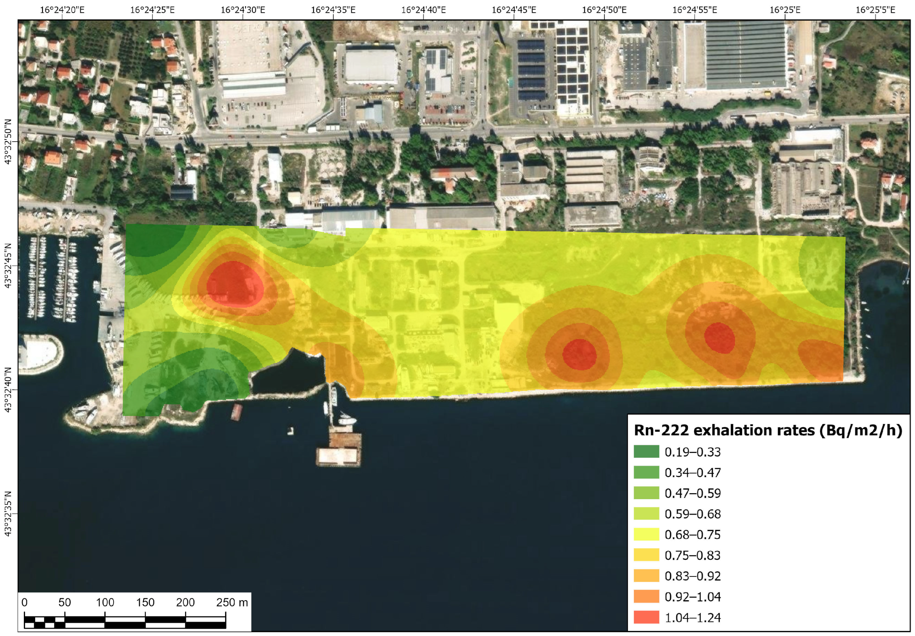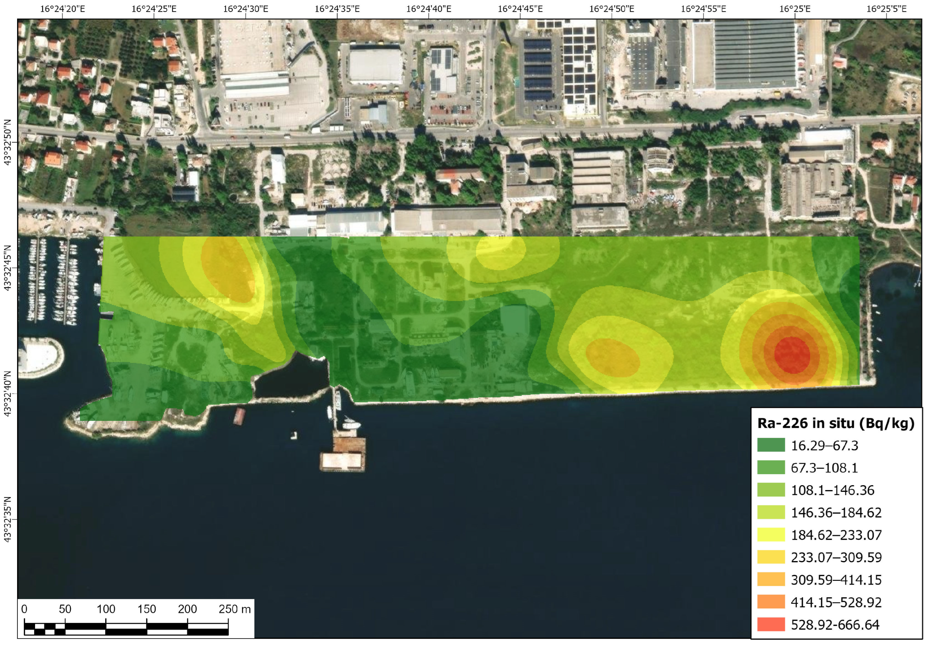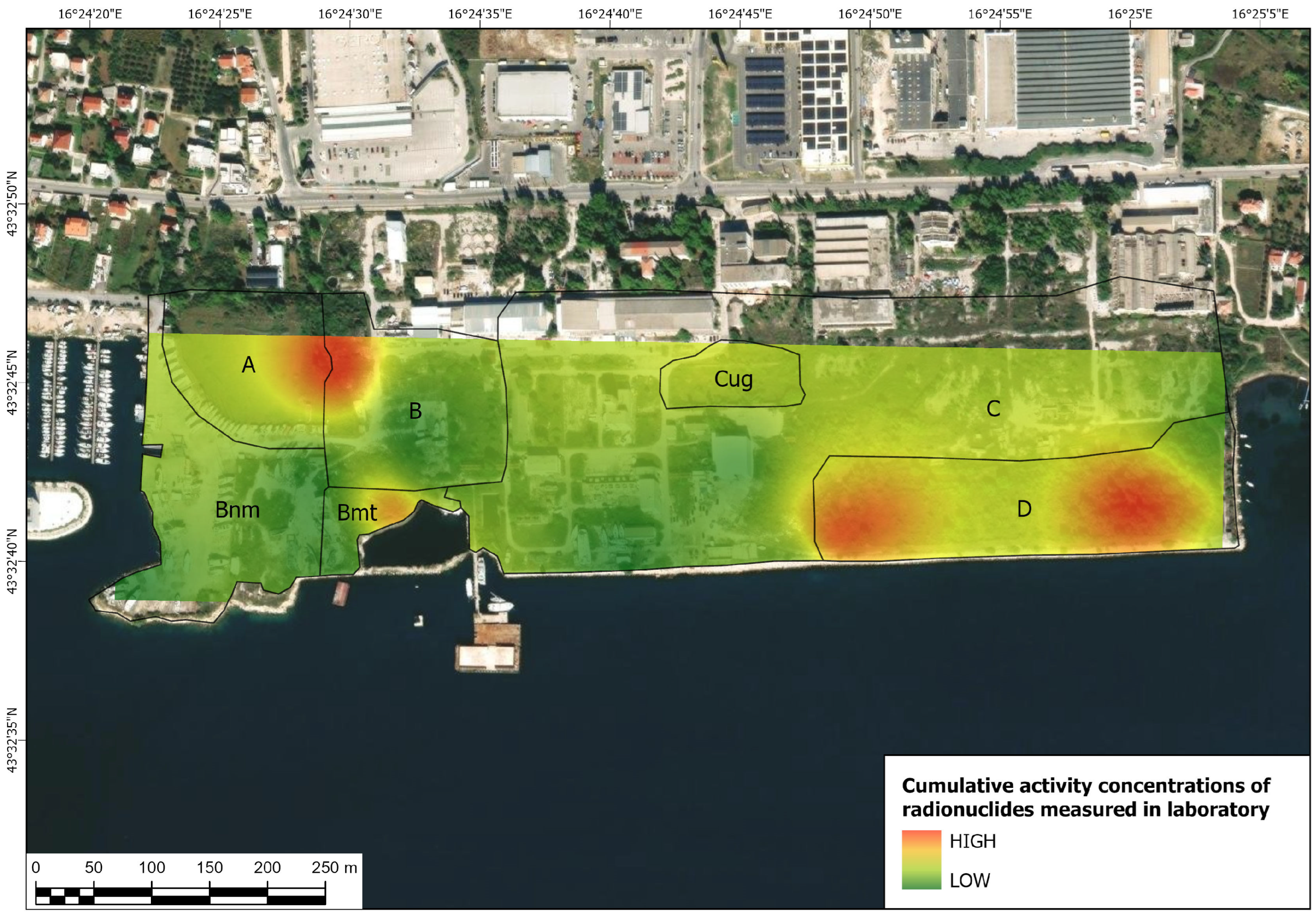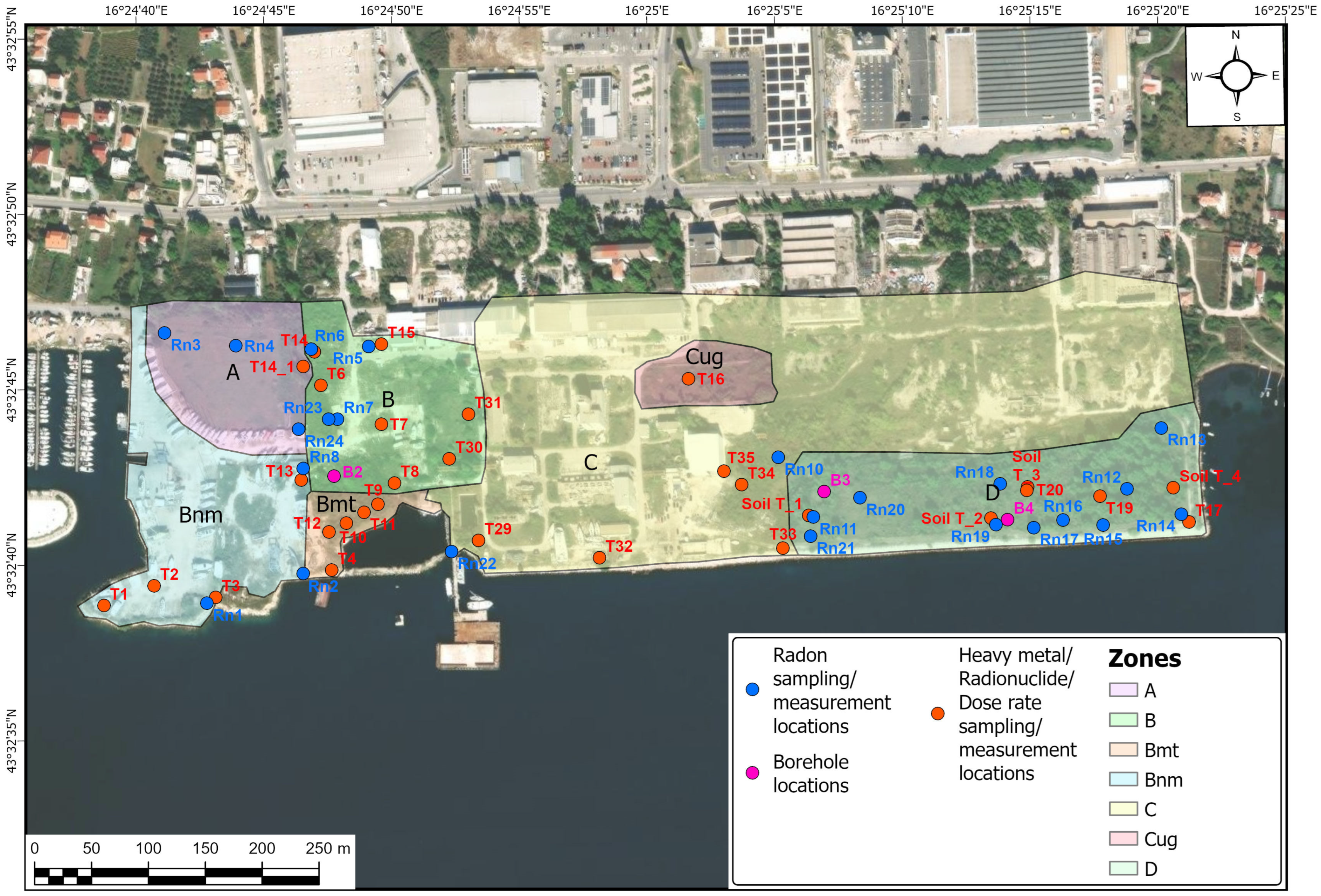 - Zone “A”—NORM residue disposal site in Kaštel Gomilica, under regulatory oversight, containing 38,000 m3 of coal combustion residuals transported from different coal-fired power plants in the former SFRY. Although the material is in fact NORM residue (coal ash and slug), according to the “Decision of the sanitary inspectorate” [25], it is defined as “uranium ore tailings from coal” due to the high percentage of uranium in certain coals extracted and utilized in the former SFRY. Materials disposed of at this regulated disposal site are “leftovers” from the SFRY’s program for the extraction of uranium from U-238/U-235-rich NORM residues and experimental processing to yellow cake, which ended in 1973 [26], and the disposal site was engineered to specifications and formally decommissioned, preventing further activity in the same year. Most of the area of this zone is under a concession contract entrusted for use to a private enterprise, Marina Kaštela d.o.o., in 2014 for the duration of 30 years, under the condition of being safeguarded and not disturbed in any way. Since the disposal site is closed and under regulatory oversight, this area is not of primary interest to this paper, although part of the carried-out research encompasses it.