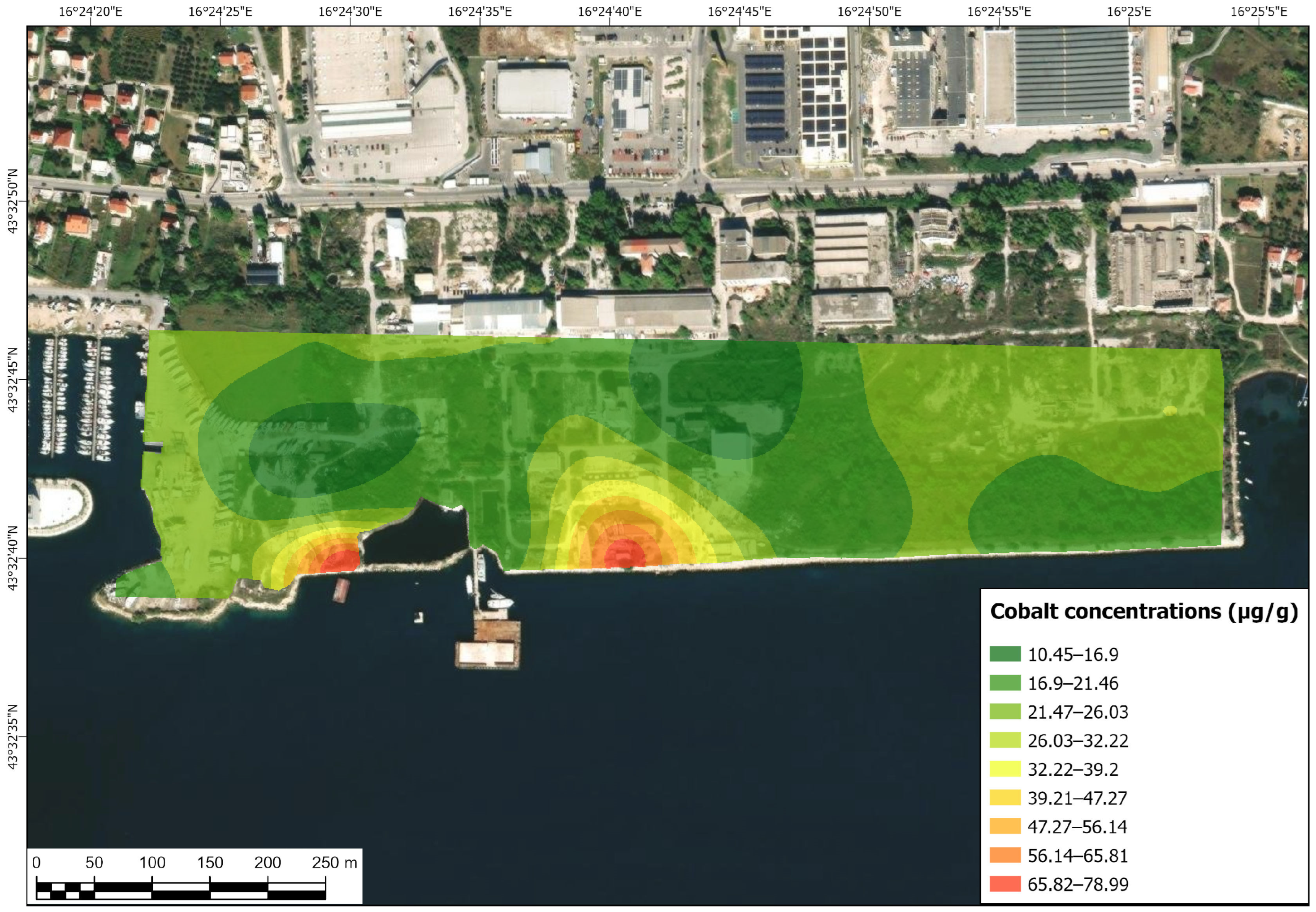 - Zone “D”—The coal combustion residual precipitate disposal site (in Kaštel Sućurac) composed of 180,000 m3 of combustion residuals deposited from the ex-Jugovinil factory’s local power plant, utilizing hydro-transport of the material, which precipitated in a specifically designed and protected zone created by the construction of the seawall and filling the consequently gained area with geological material. The outer wall of the disposal site (seawall) now forms the wave attenuator of Kaštela Bay. The disposal site was formed in the 1980s and utilized till the 2000s.