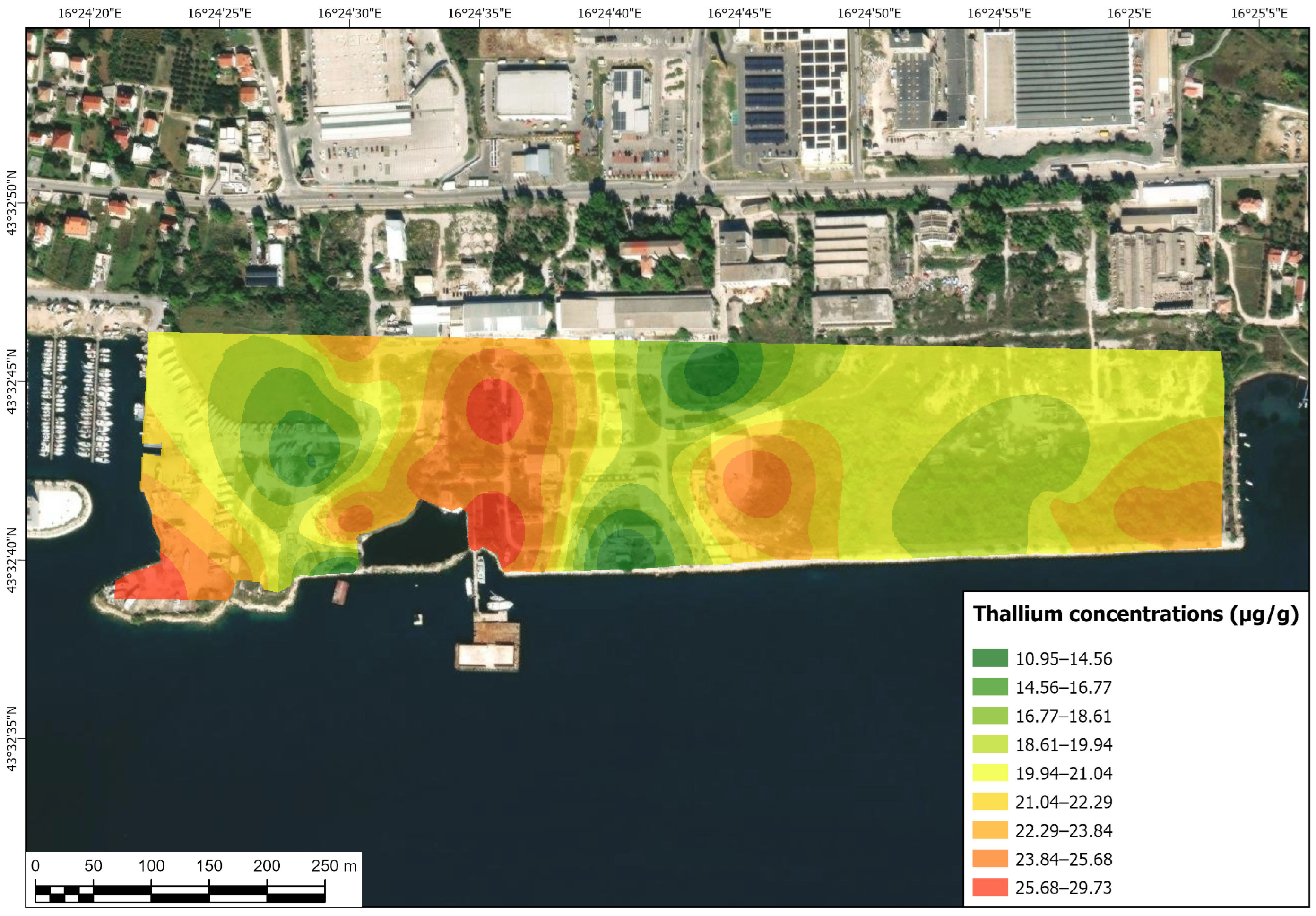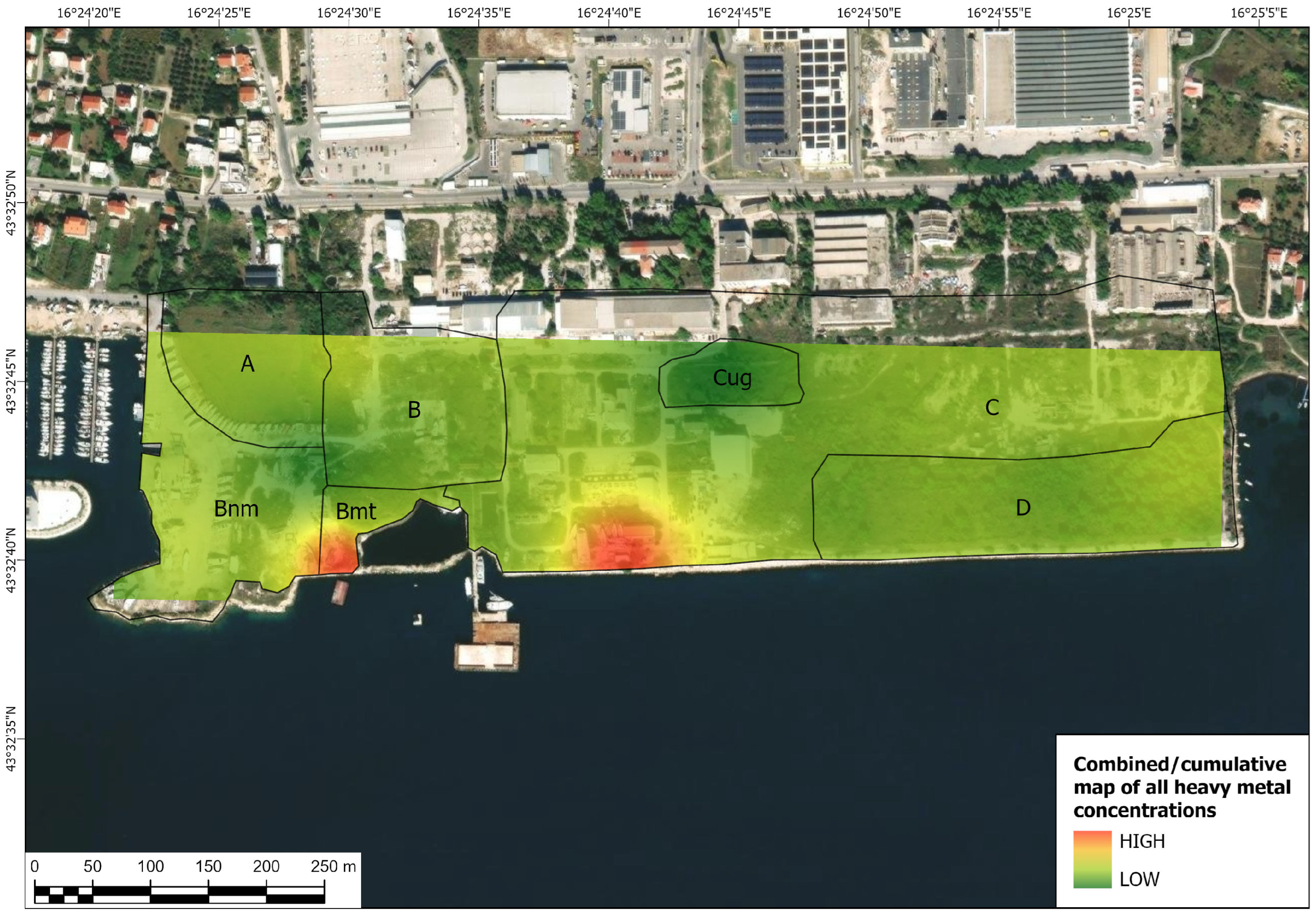 - Zone “Bnm”—An area created during the last three decades (since the area was given into concession) by dumping waste rock and soil into the sea (excavated material from other locations: during the building of a commercial center in the city of Split, Croatia, construction of a highway nearby Split, etc.) in order to construct a marina, berth, mooring and dry dock with the supporting facilities.